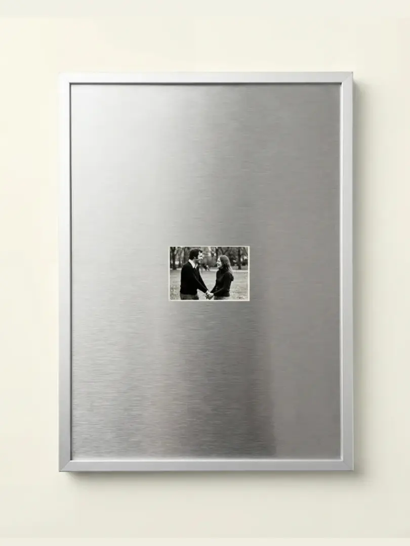 This silver frame is fitted with a silver aluminium backing rather than a paper mount. Photographs are placed directly in front of the backing, allowing you to position images freely in any orientation. The clean metal surface creates a simple backdrop fo...