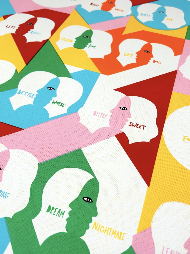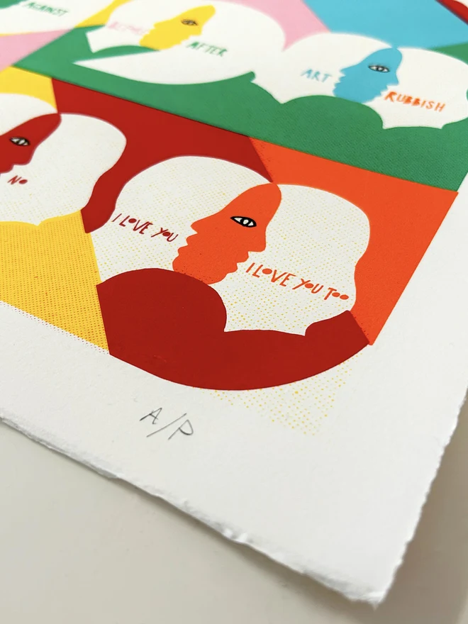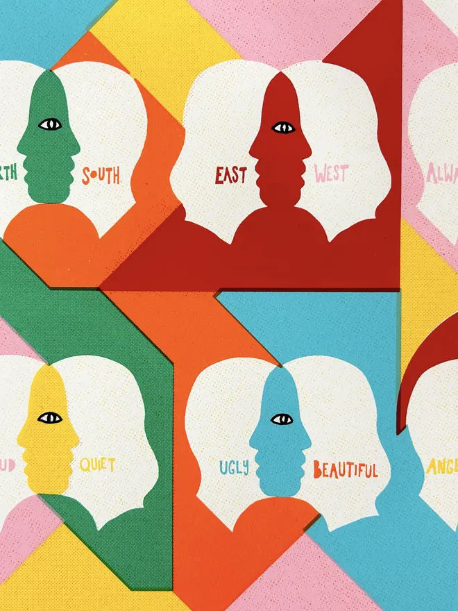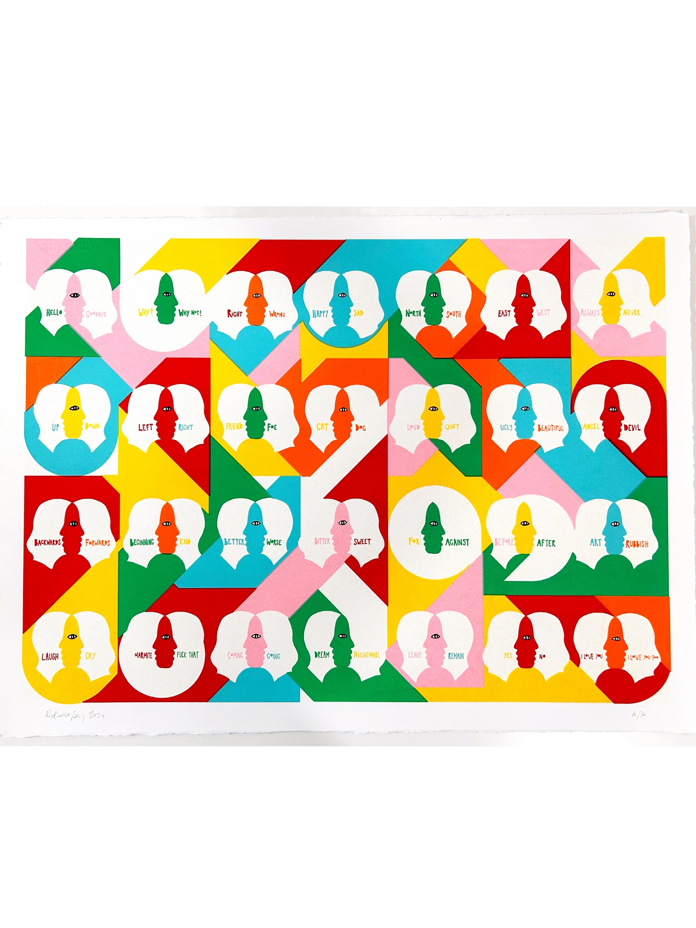 Magnets is a 7 layer screen print hand finished on beautiful 300gsm Somerset Satin paper. The theme is making space for each others opinions and identities and still managing to find love and empathy. Otherwise, what's the point?!