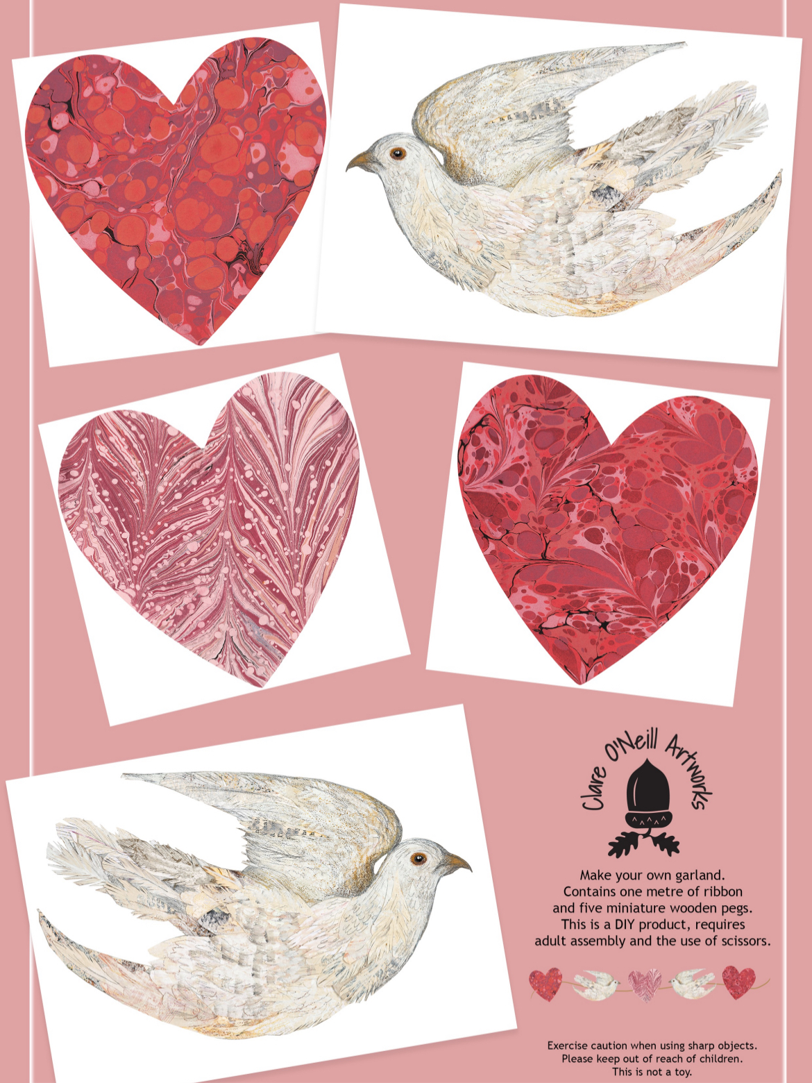 Includes two white doves and three marbled hearts to cut out.