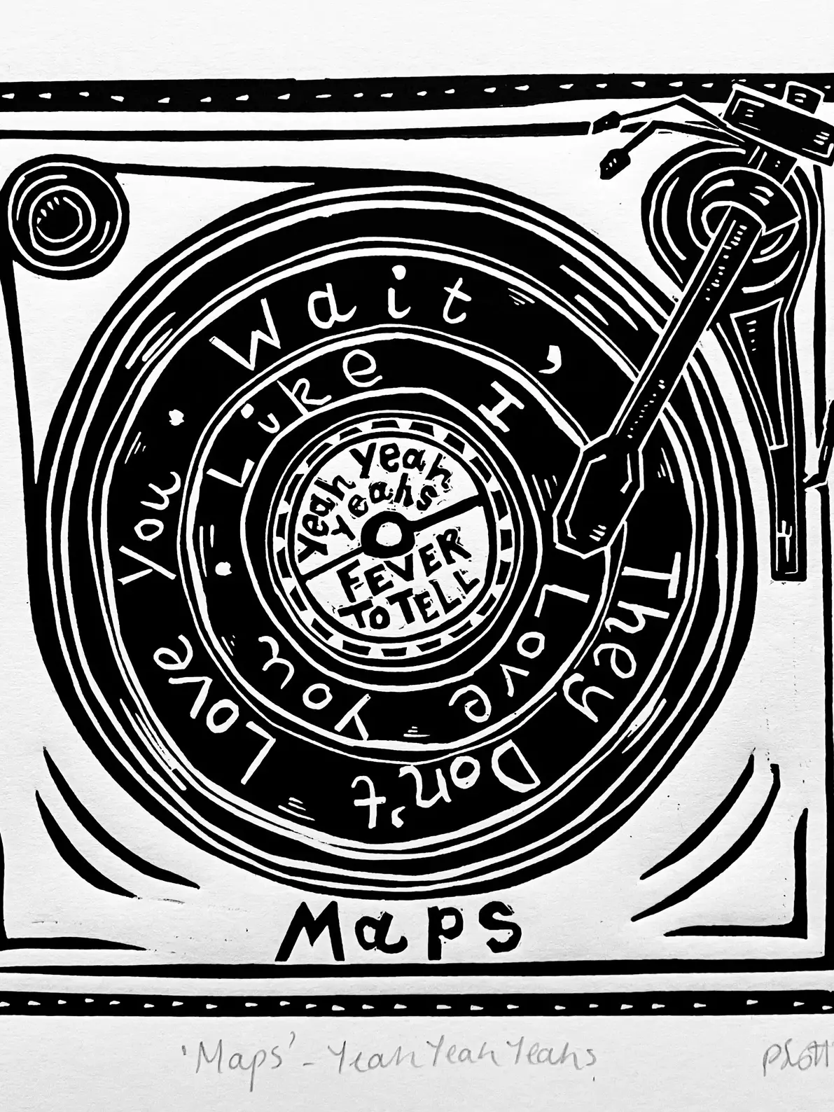 Original linocut print featuring lyrics from the song 'Maps ' by the Yeah Yeah Yeahs, from their debut album 'Fever to Tell' from 2003.