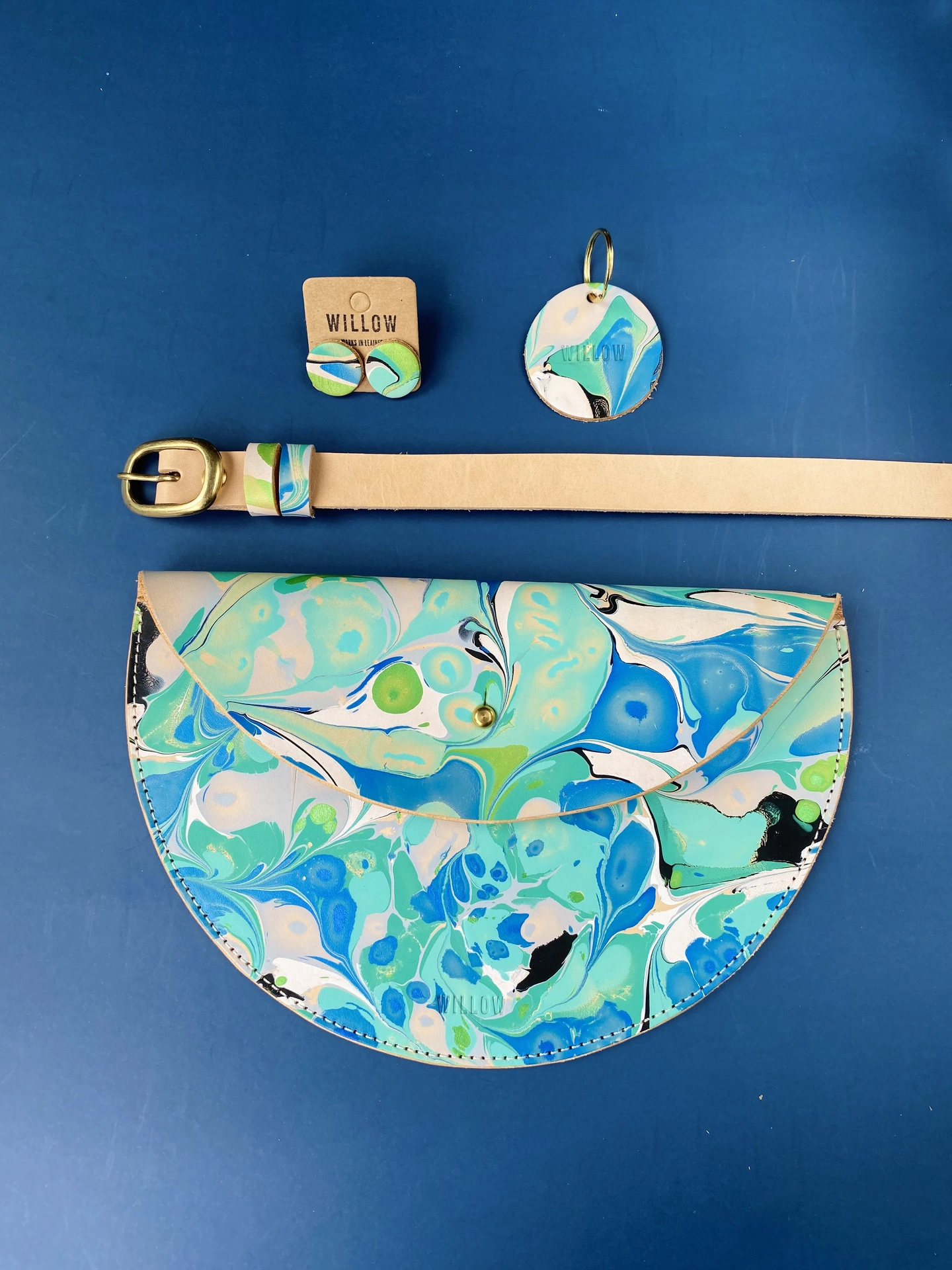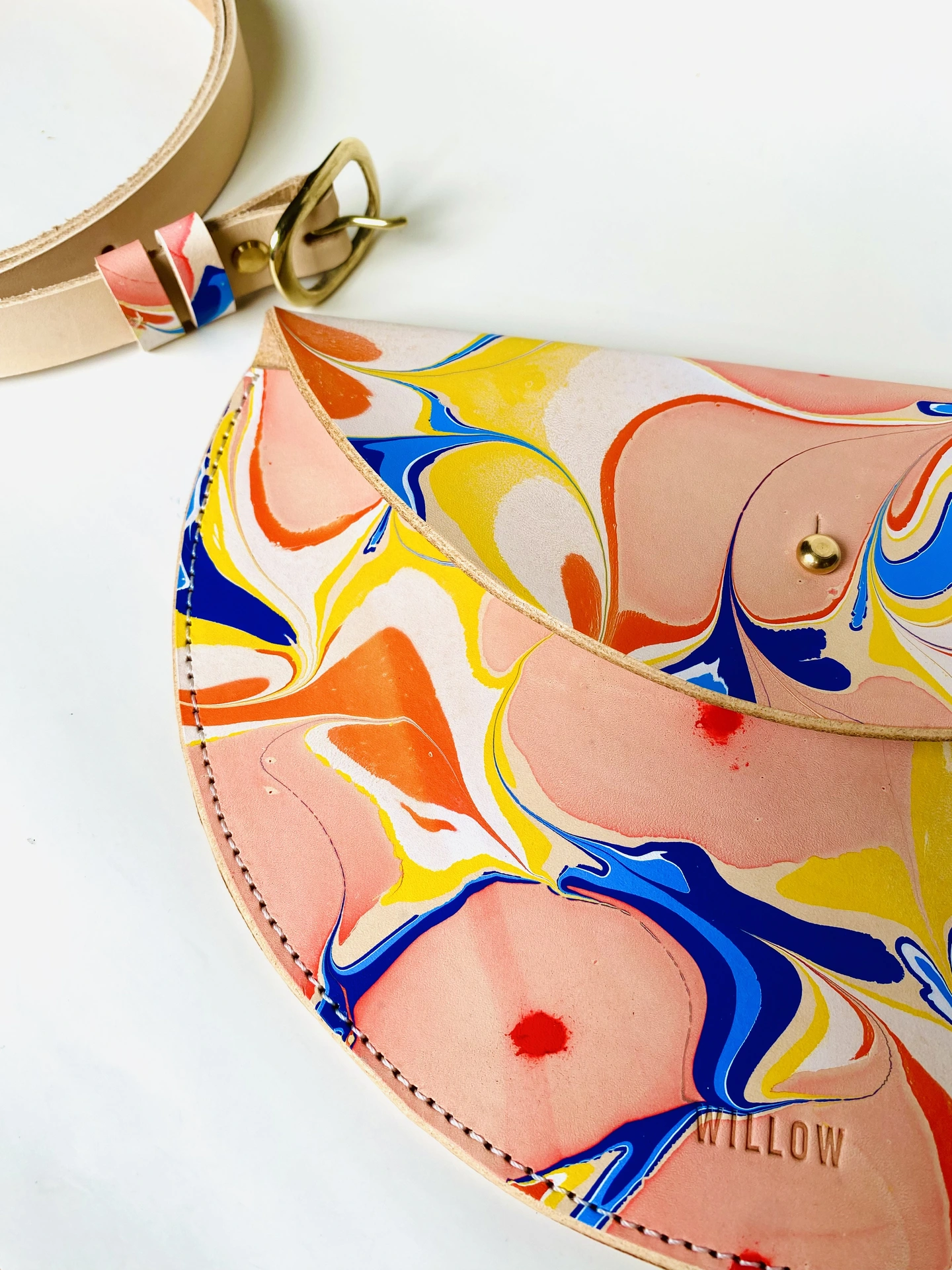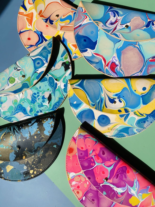 These beautiful statement halfmoon bags are hand marbled, which is an age old traditional technique of floating paints and dyes on the surface of water, to produce a one-of-a-kind pattern, available in a number of colours.