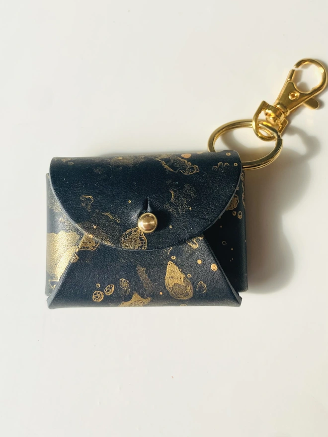 These striking statement marbled mini purse keyrings are hand-marbled using an age old technique of floating paints and dyes on water, creating mesmerising, one-of-a-kind patterns, each one a miniature work of art, made to carry with you wherever you go.