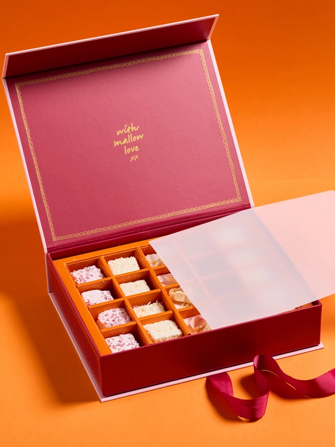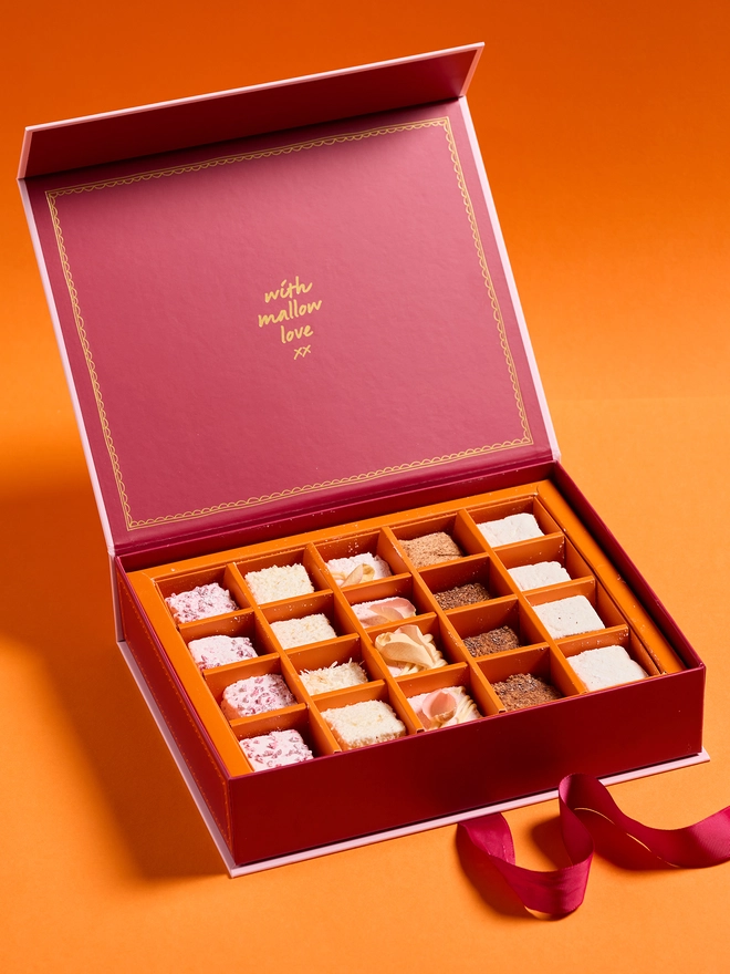Looking for something a little unique? Our Marshmallowist treat box offers 24 gourmet marshmallows presented in our glam gift boxes. Featuring our bestselling mallows from dark chocolate to raspberry & champagne and starring raspberry and rose petals, this is the perfect way to try all our flavours and share them too!