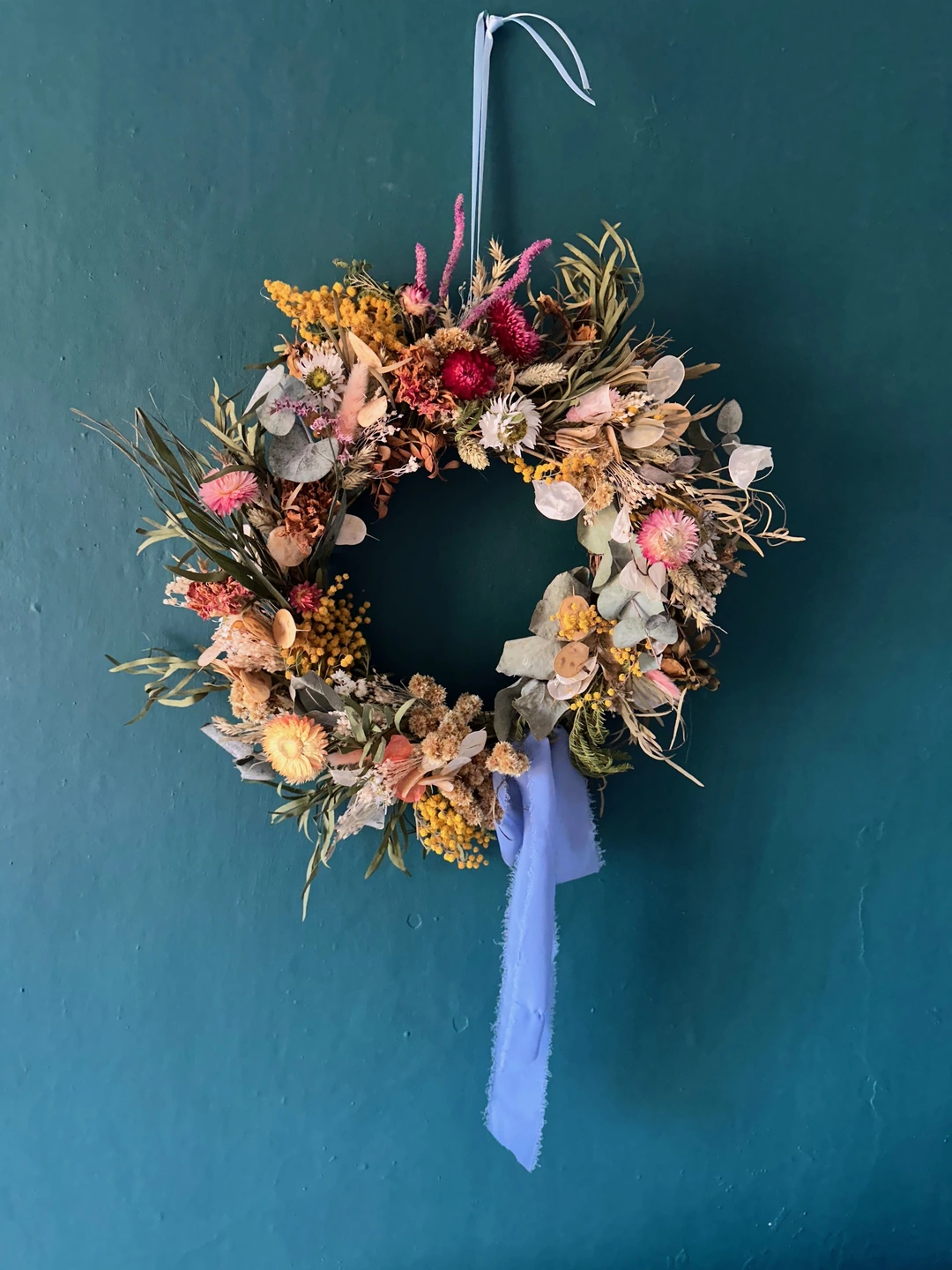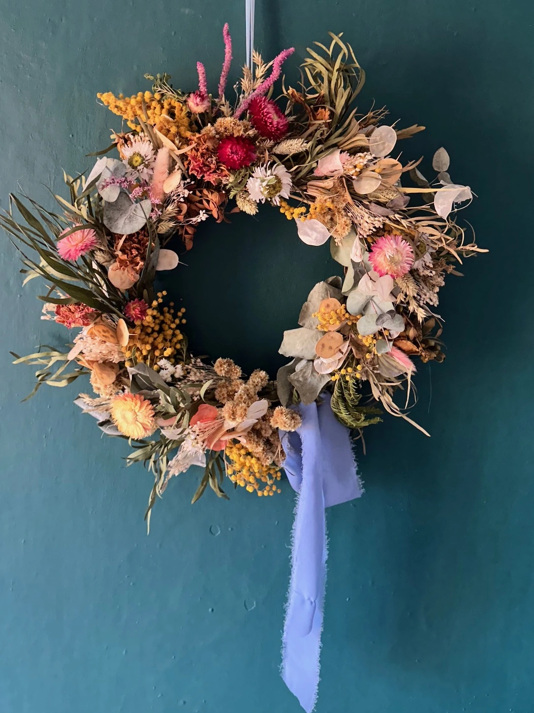 A joyful, nature filled, wild rustic wreath. Made from a vibrant spring selection of dried florals. Soft pinks, berry reds, creamy whites and golden tones. Wild foilage, eucalytus and mimosa are just a few of the flowers in this beautiful wreath, Finishe...