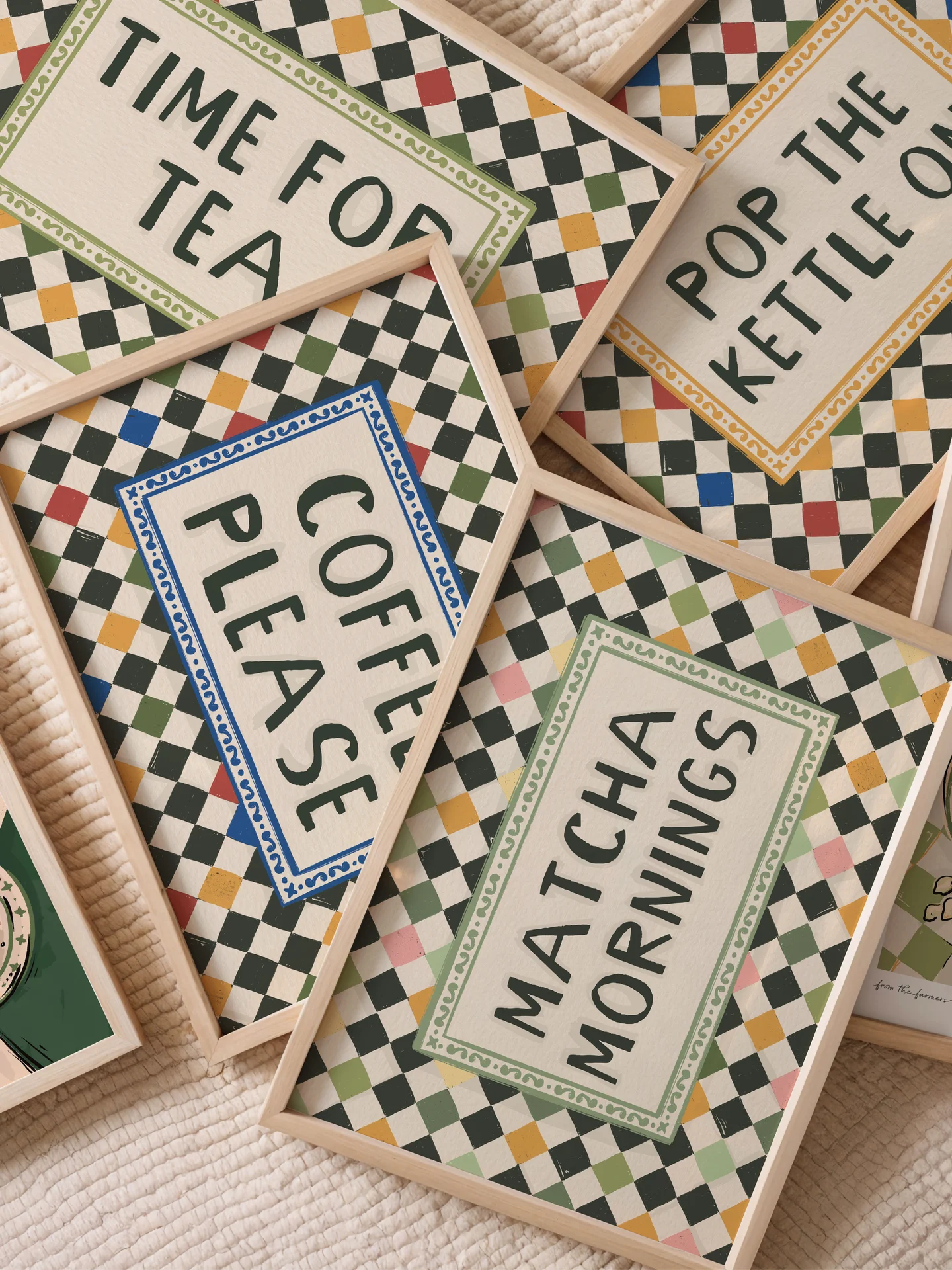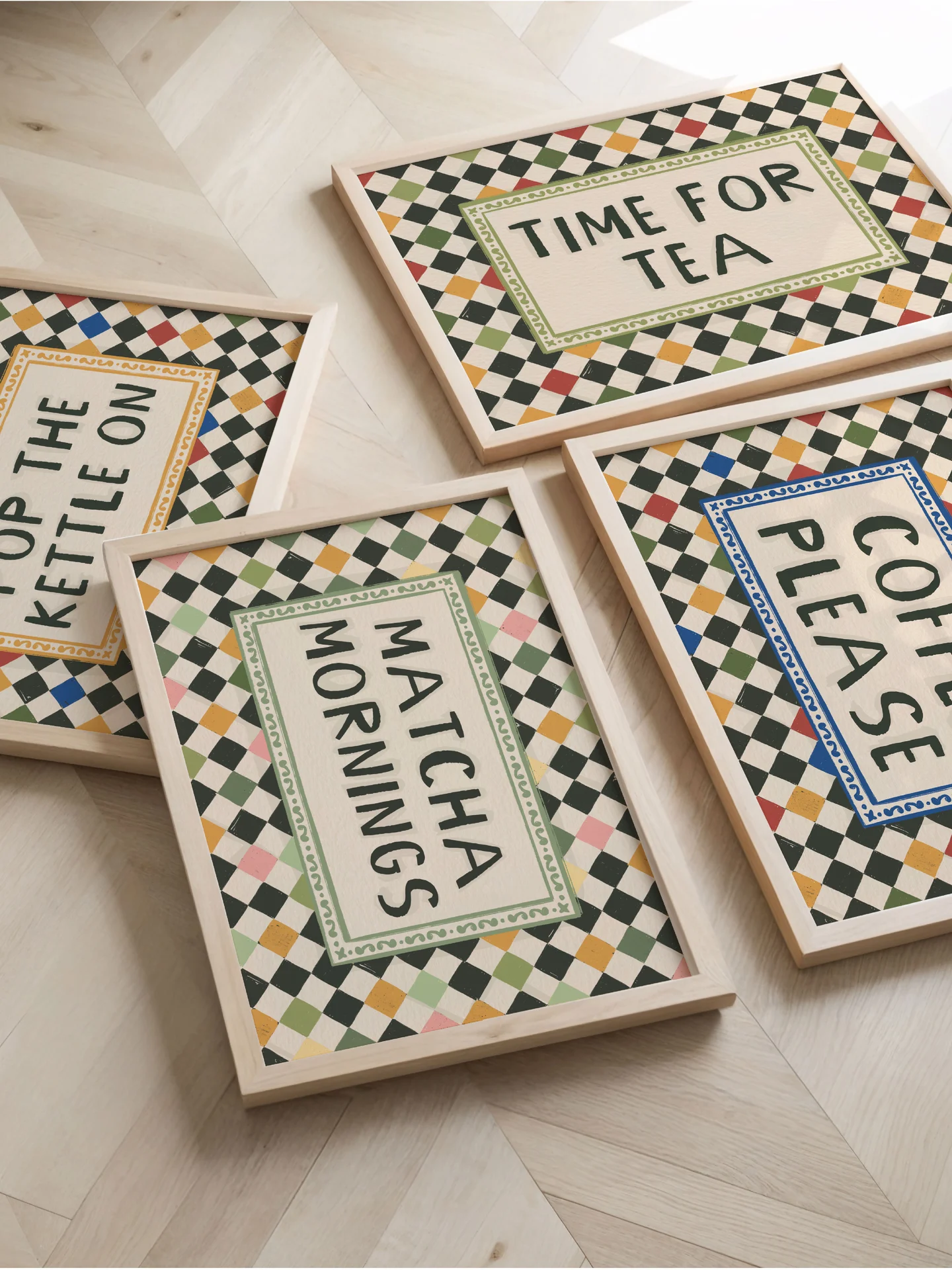 Part of 'From the Farmers Market' Kitchen Print Collection. This print captures the playful demand for Matcha Mornings. Featuring a tasteful harlequin check tile background in greens and pinks. A great accompanying print for others in the 'from the farmer...