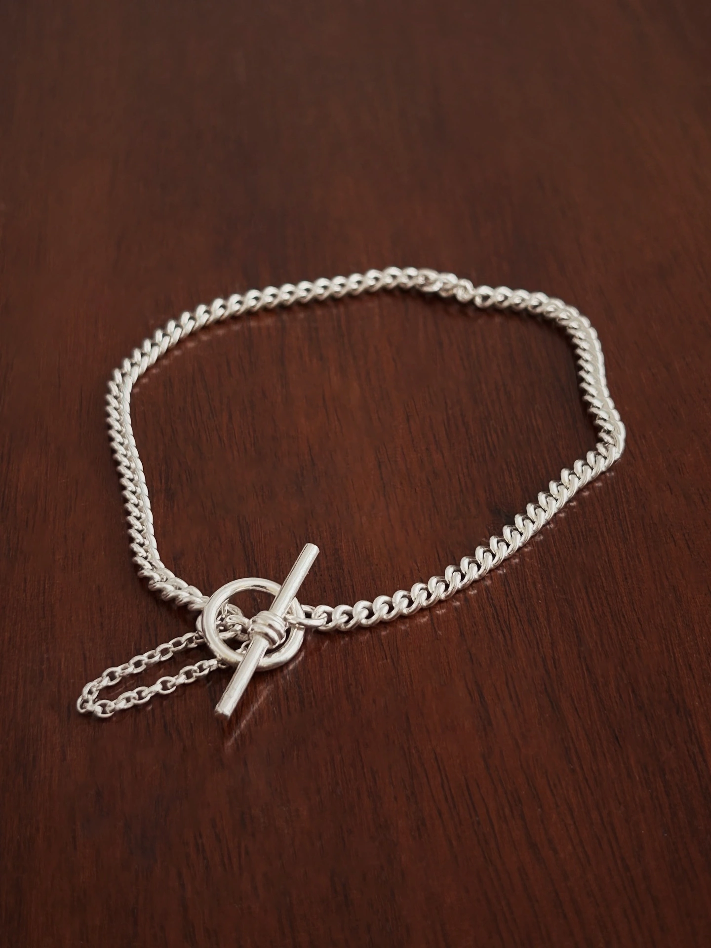 The bracelet chain is a traditional curb with interlocking links that lie flat and smooth against the skin. First developed in the 19th century and named for its resemblance to the curb bit used in horse bridles, it soon became a favourite for Victorian watch chains and fobs. Admired for its strength, flexibility and subtle shine, it has remained a classic ever since.
