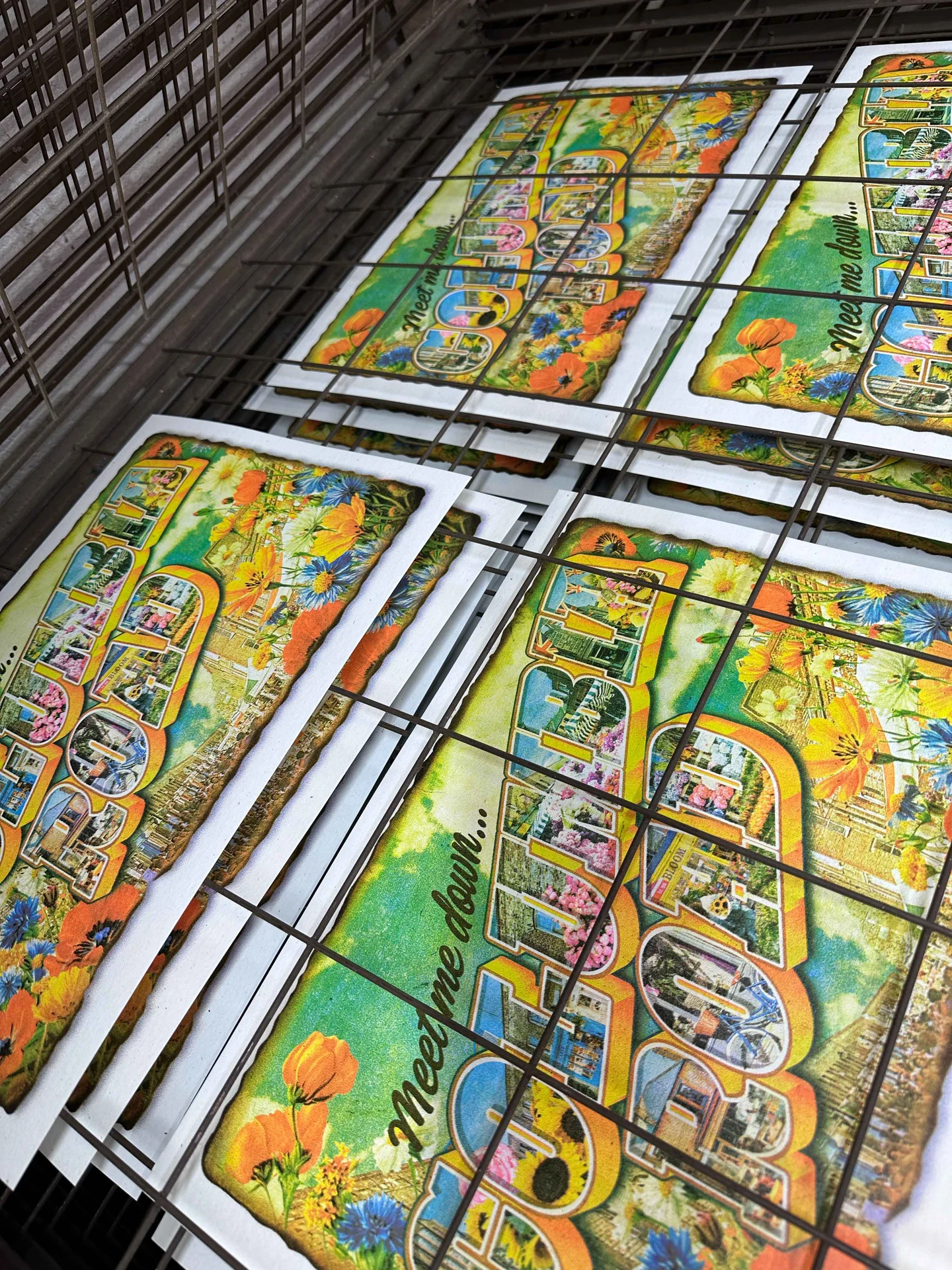 A 4-layer hand-pulled stochastic CMYK screenprint capturing the vibrant, bustling atmosphere of London's famous Flower Market. This piece successfully resolves the long-standing artistic quest to combine challenging typography and intricate collage into a cohesive, retro-themed form.
