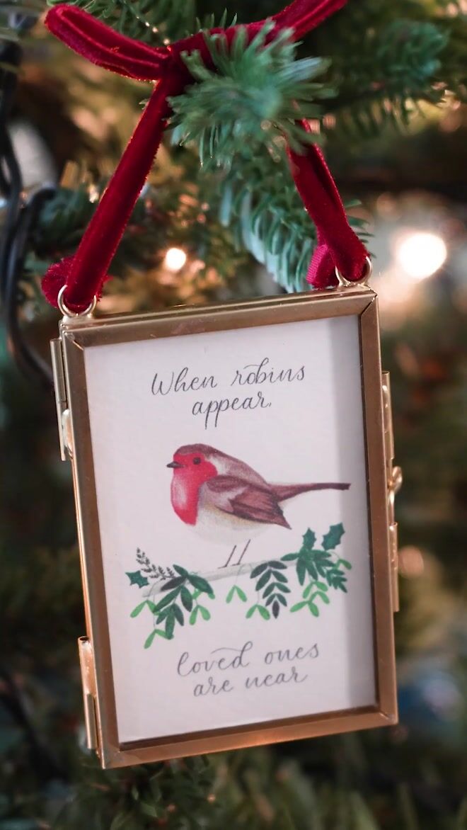 A beautiful mini frame Christmas tree decoration with an illustrated robin to remember a special loved one this Christmas. Choose between a personalised frame with space for name and dates or 'When robins appear, loved ones are near' poem design (not per...
