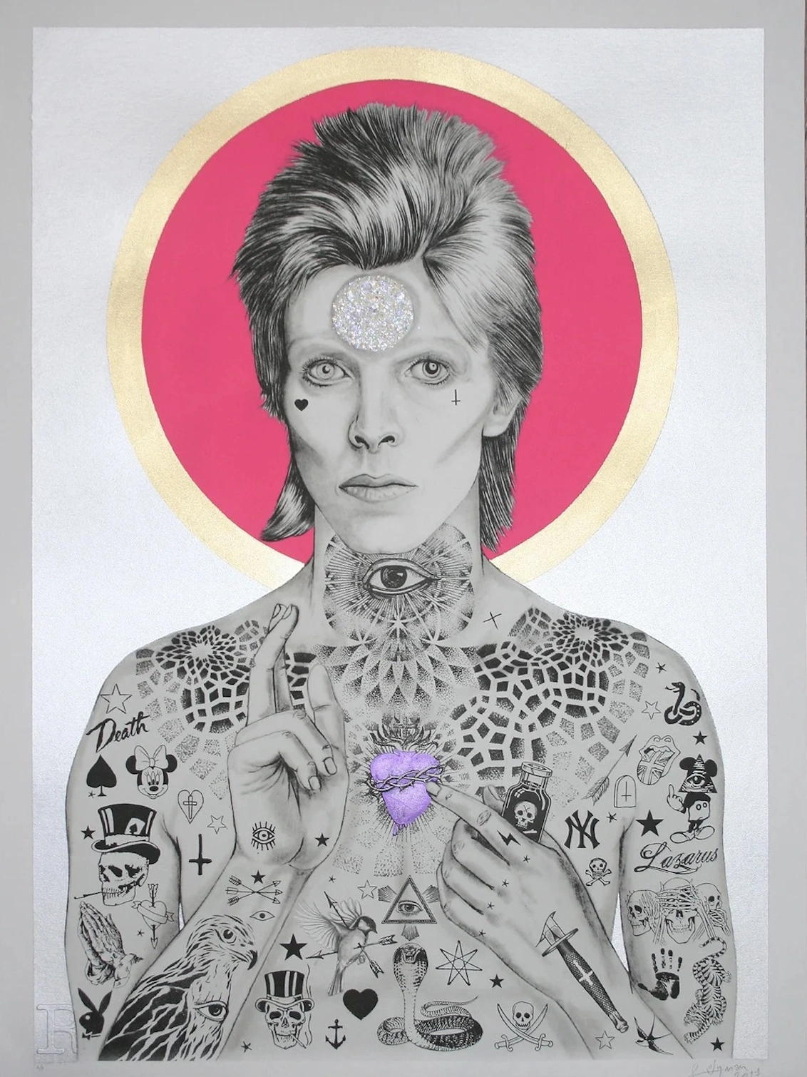 Each print has been hand sprayed with neon pink and silver paint and hand finished with diamond glitter and gold leaf.