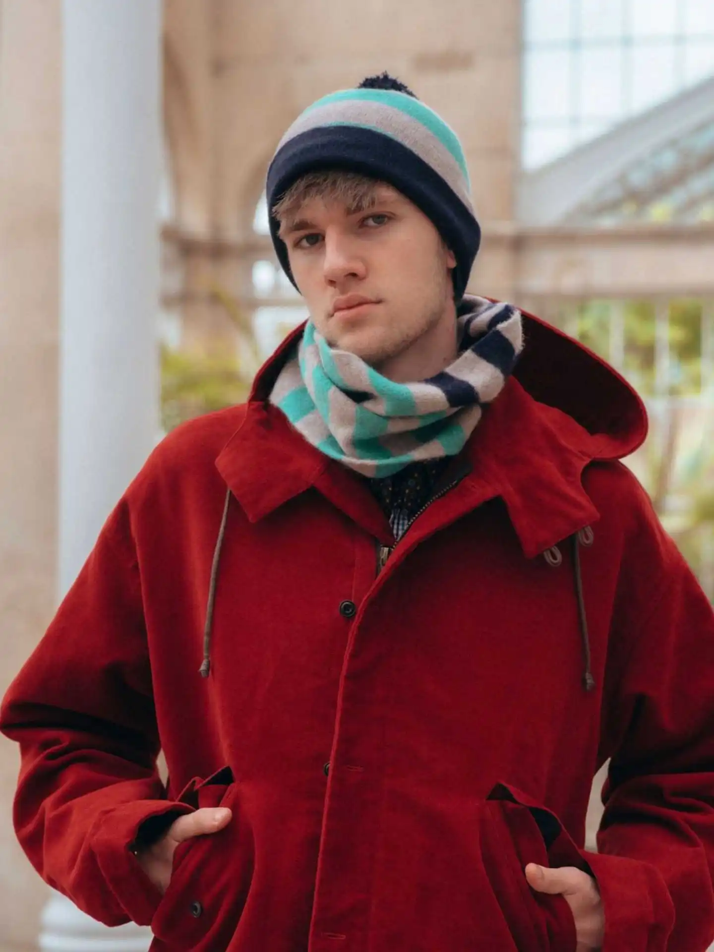 Merino Wool Snood In Jade, Mushroom & Navy Stripe