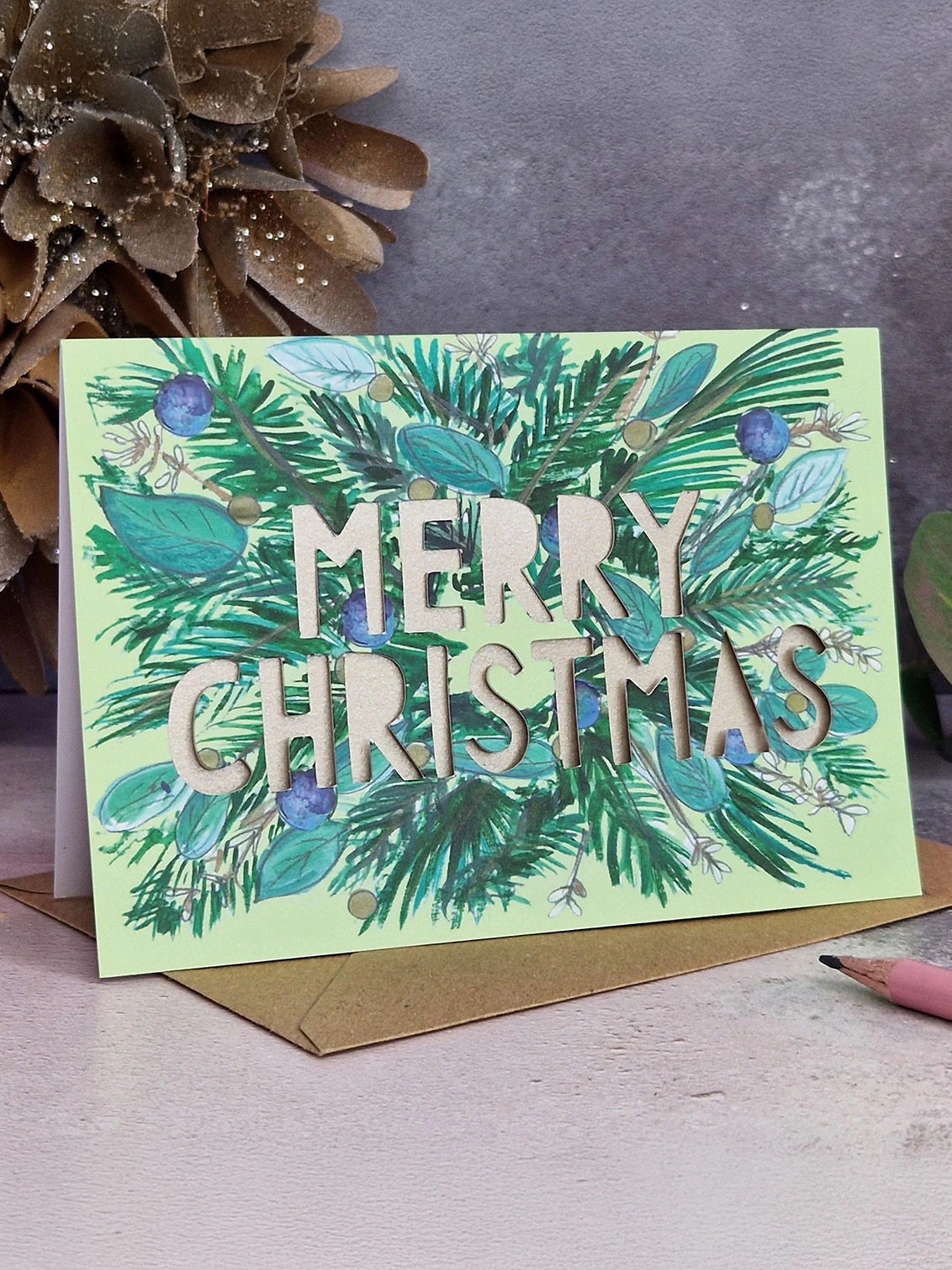 Send a shimmery 'Merry Christmas' with this stunning printed card with paper cut text. Printed onto thick card using my original watercolour illustrations with die cut typography backed with shimmering mink metallic backing paper. Keep forever to bring ou...