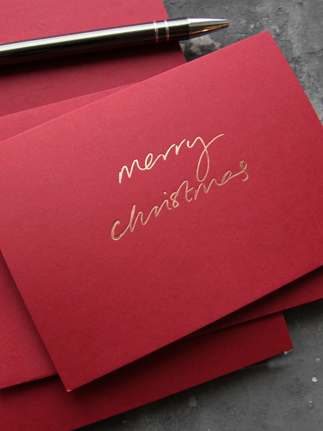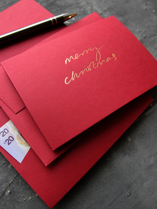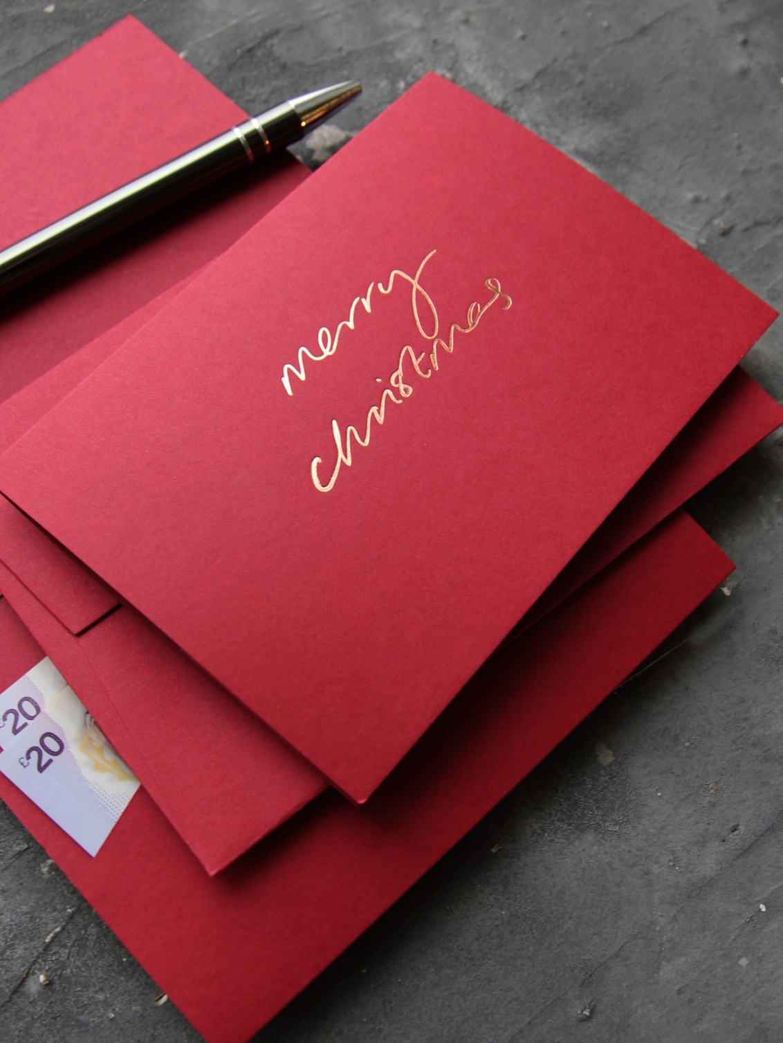 Our Merry Christmas cash card is handfoiled in rose gold on rich scarlet paper. The perfect mix of festive and luxury. Slip in some cash, tickets, or a cheeky IOU and you’ve got a gift that’s simple but still feels special. Comes with a matching envelope, because even money deserves good packaging.