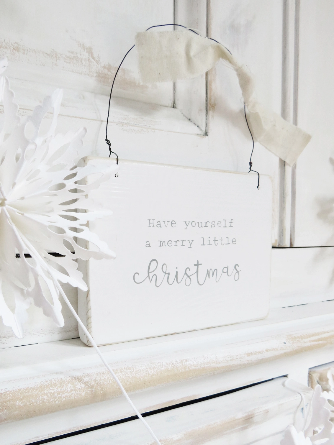 Painted in a chalky white, the edges are distressed slightly before the lettering is hand painted on.