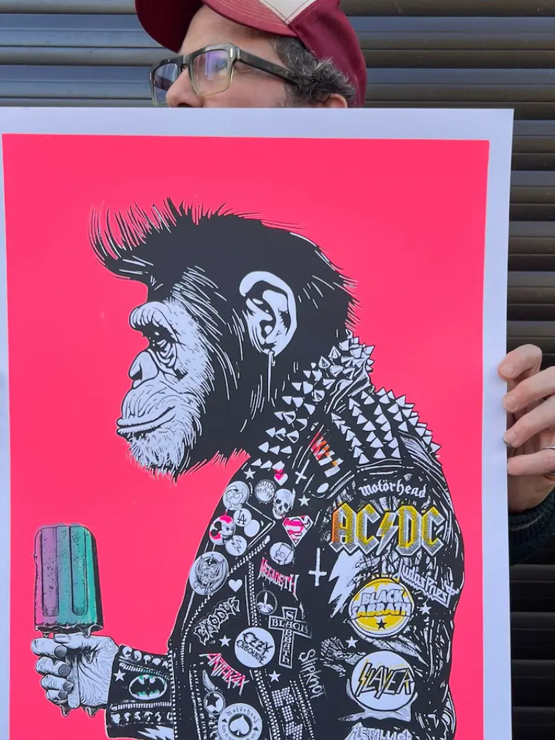 A limited edition 4-colour screen print of a monkey wearing a punk rock leather jacket.