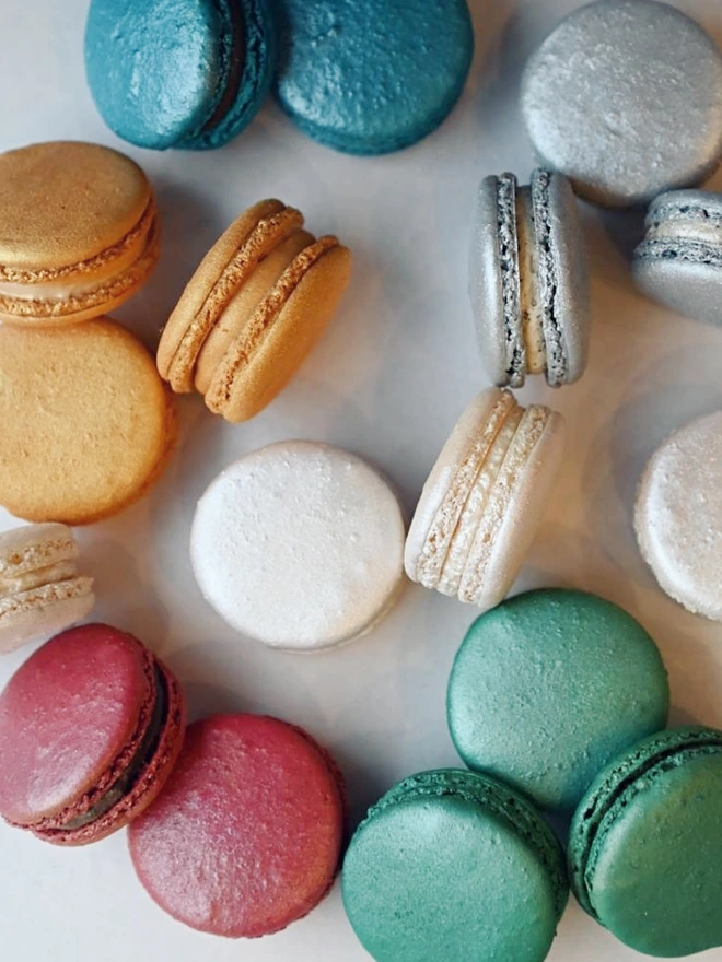 A shimmering selection of our signature macarons, dressed in a metallic finish that catches the light beautifully. Elegant, playful and designed to impress, they are perfect for making any celebration shine.
