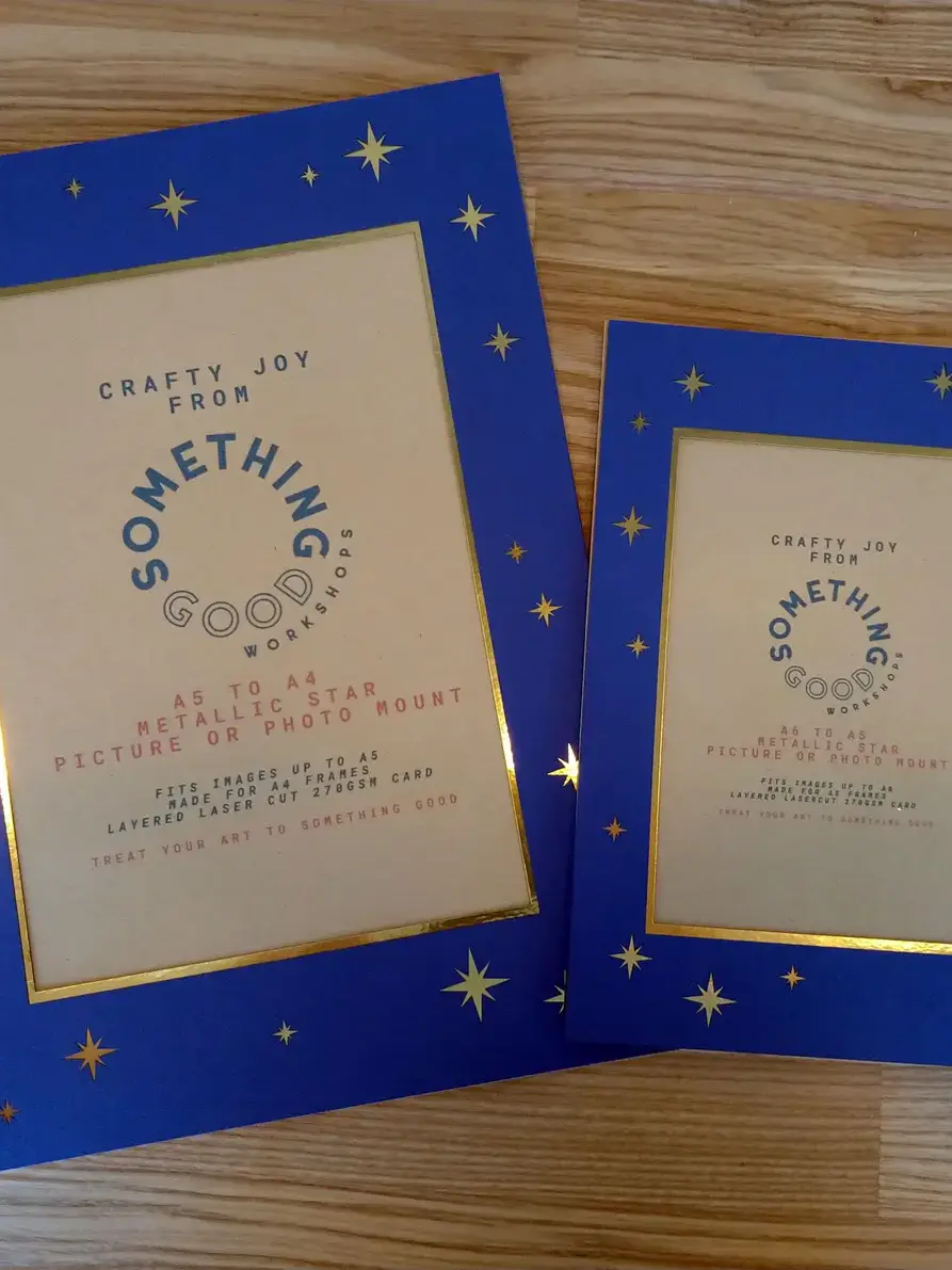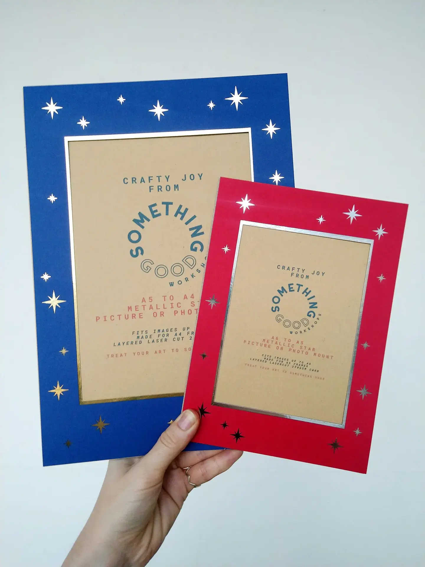 Add a little twinkle to your art or photo display. This A4 metallic star picture mount is made from two layers of laser-cut 270gsm coloured card, combining deep blue and warm red with a metallic inner for a sharp, sparkling finish.
