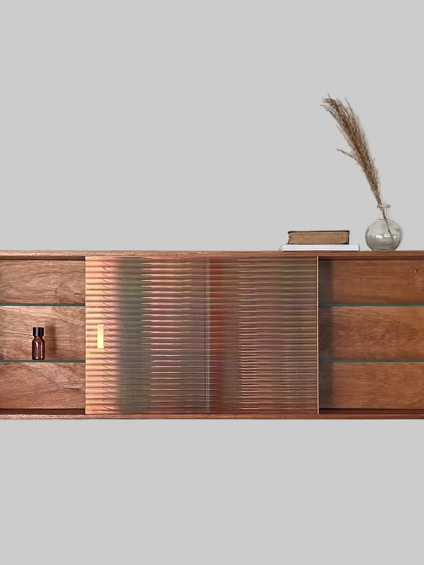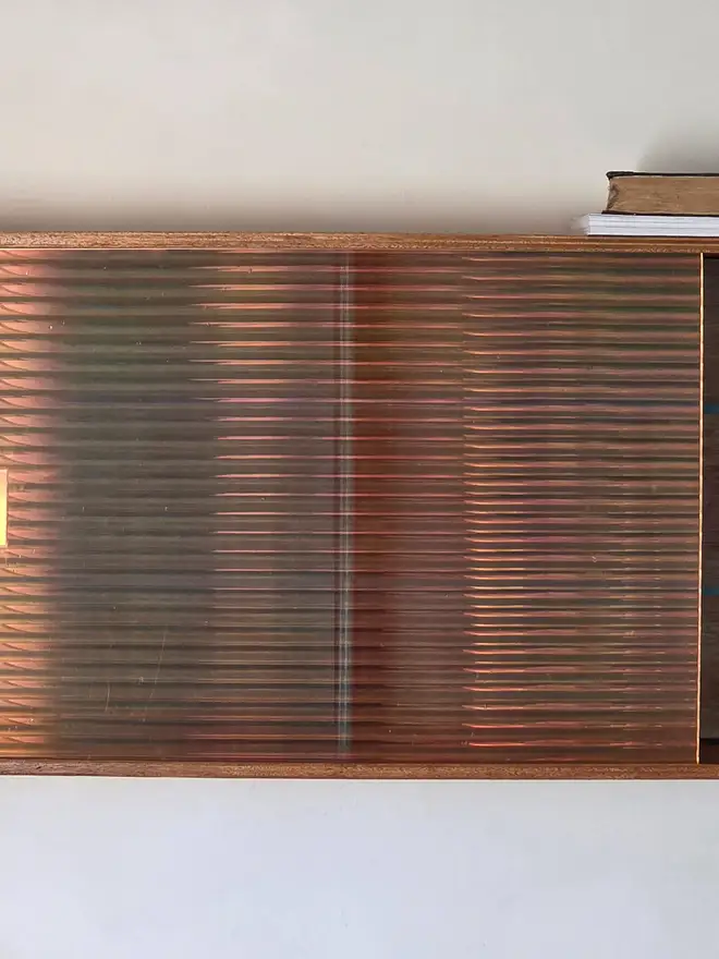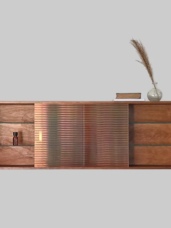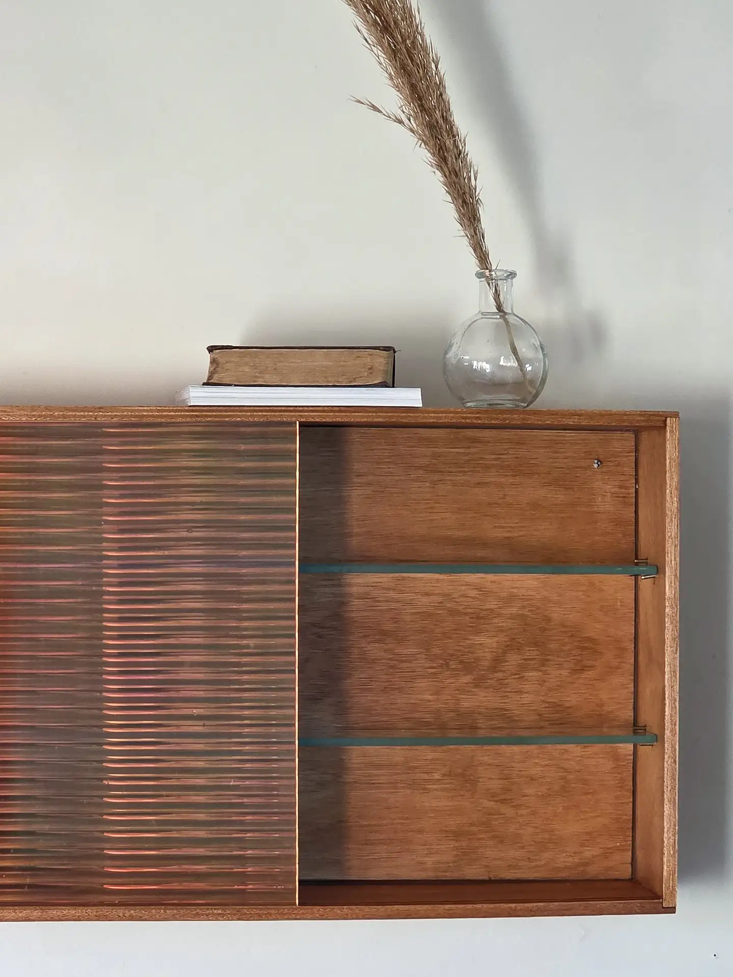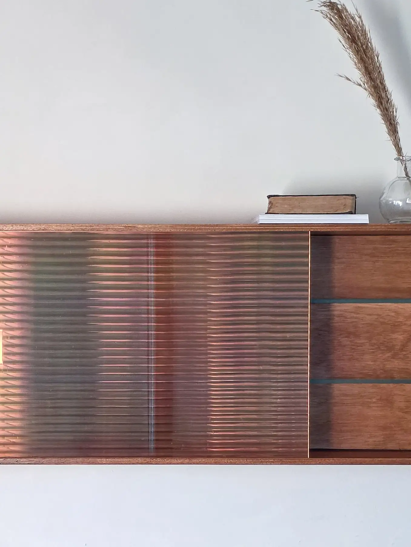 To refinish the cabinet, the wooden patina has been restored and reoiled to bring out nicely the natural grain, and the addition of a hard wearing reeded effect on the original glass sliding door adds an up to date contemporary twist. The single glass door has an iridescent quality which shimmers different colours in different lights. This is a unique feature and means this piece of furniture is entirely bespoke.