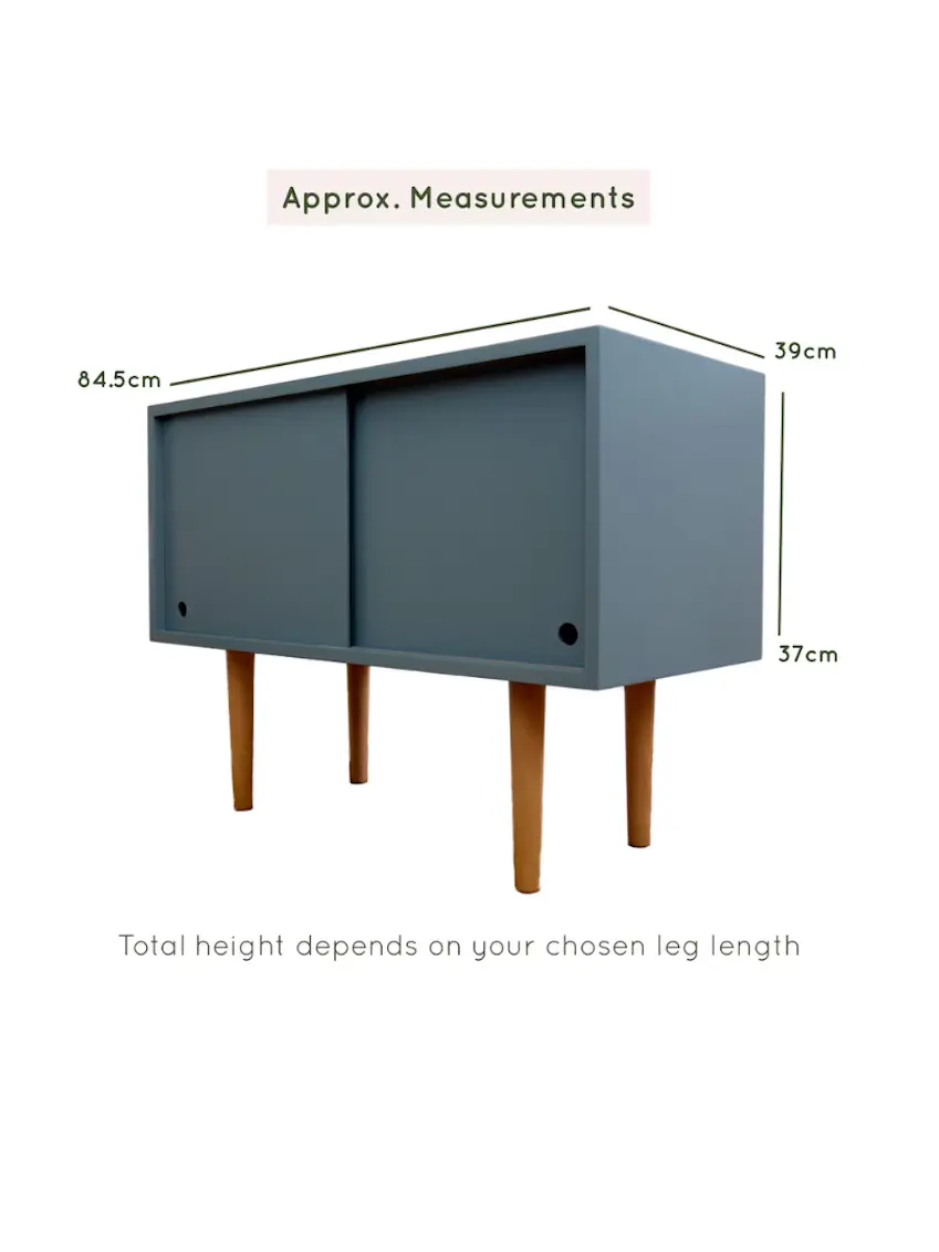 Mid-century style cupboard, ideal for use as a record cabinet, media TV unit or storage. Painted in De Nimes by Farrow and Ball