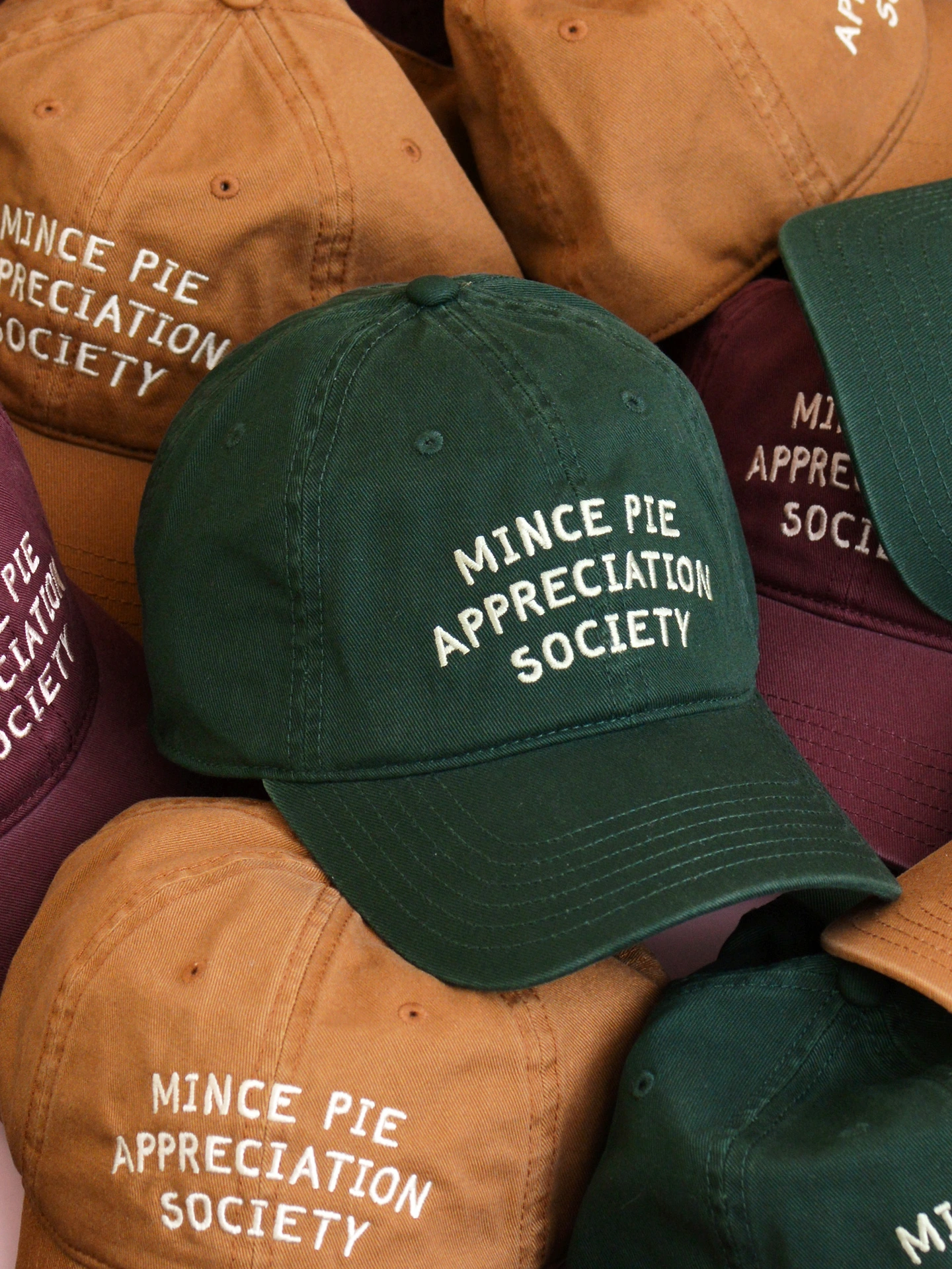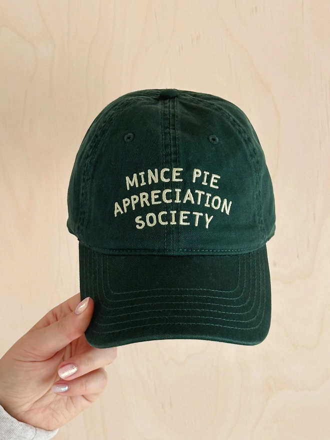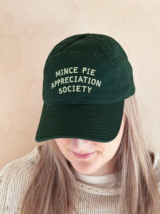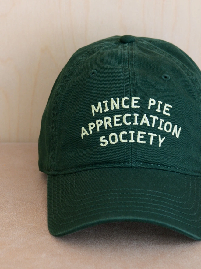 Our 'Mince Pie Appreciation Society' embroidered hat is a fun and thoughtful gift for foodies, Christmas lovers, or anyone who just can’t resist a mince pie. Available in burgundy, tan or green cotton.