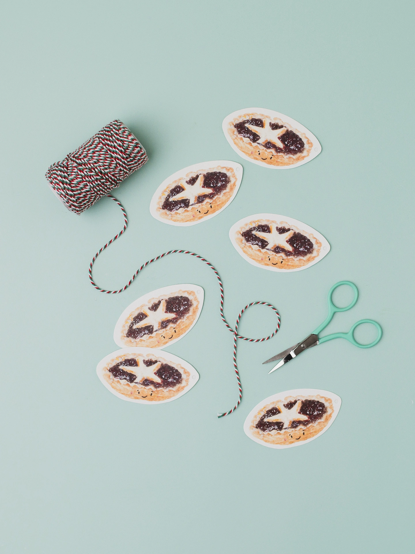 The design features a repeat print of a hand painted Mince Pie watercolour illustration, the base colour of the gift wrap is white.