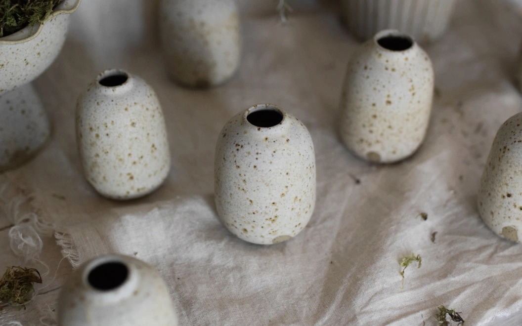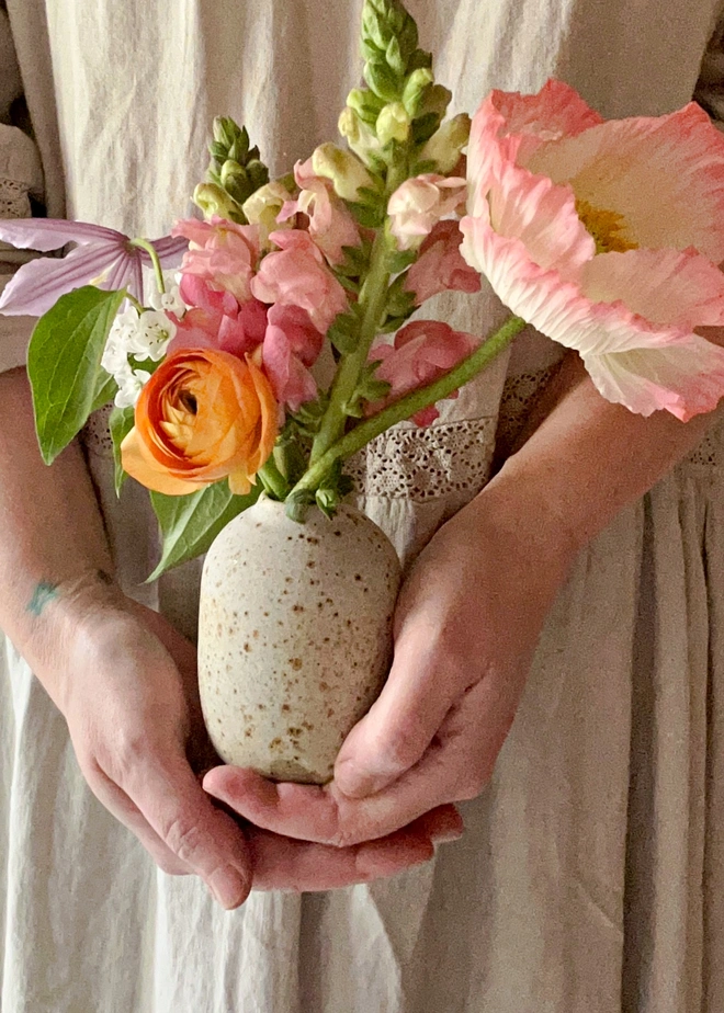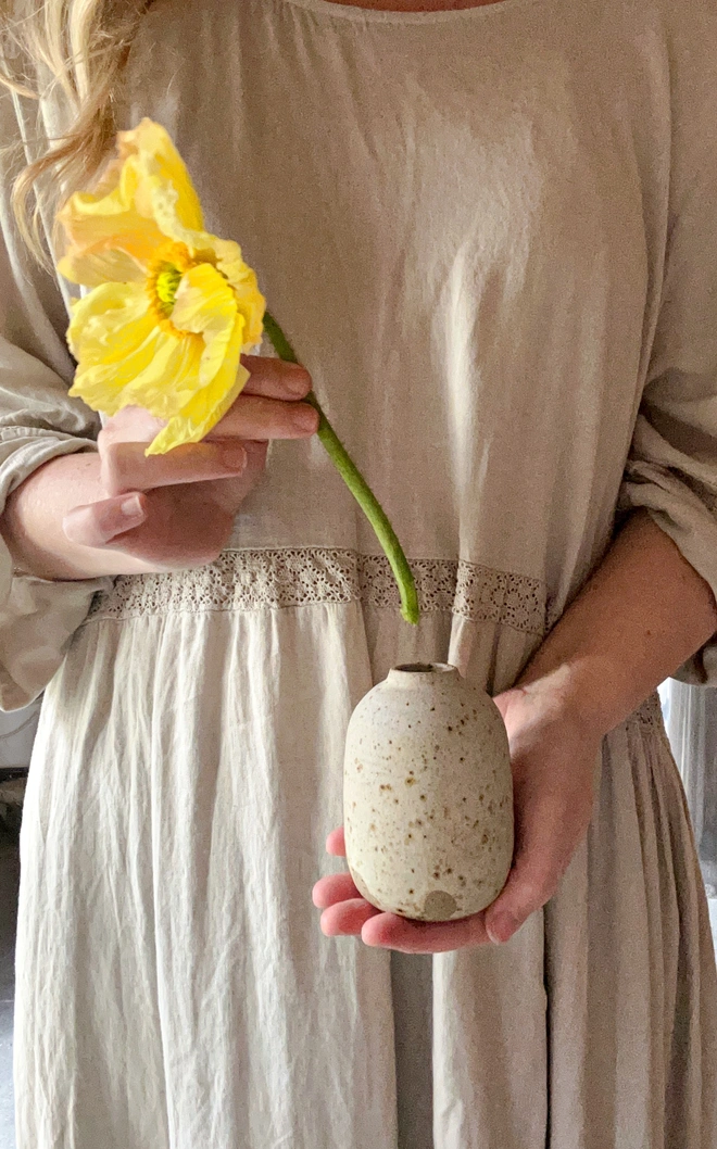 A wheel-thrown small bud vase in speckled stoneware. Glazed in chalk creamy white on exterior and clear on interior...