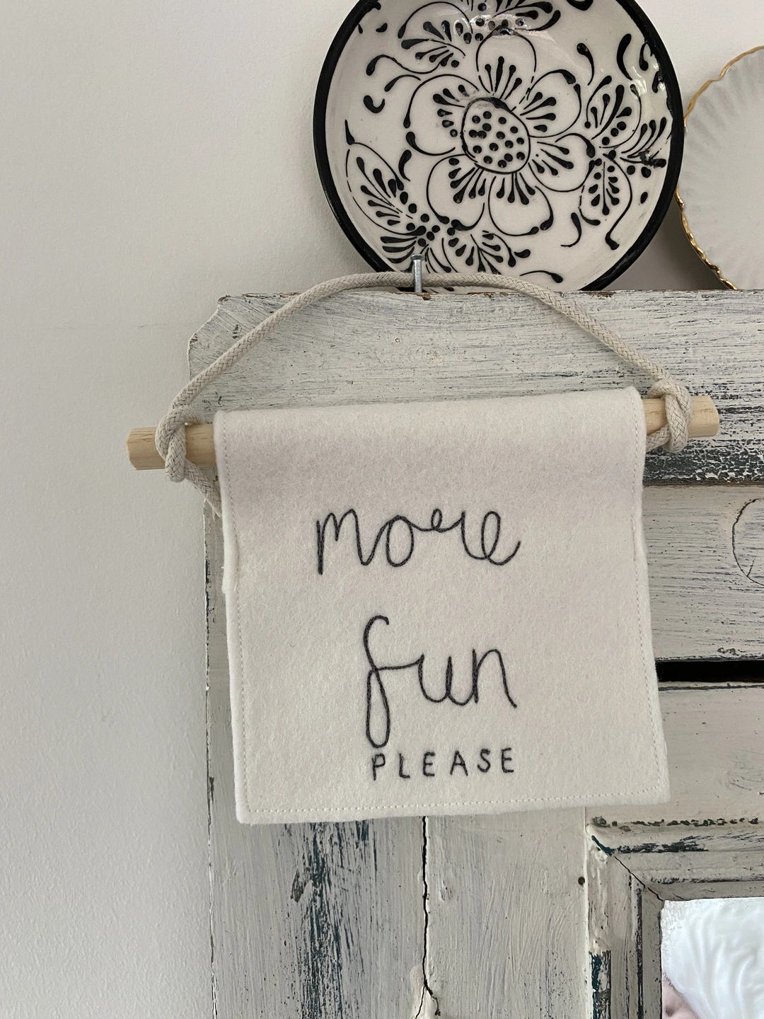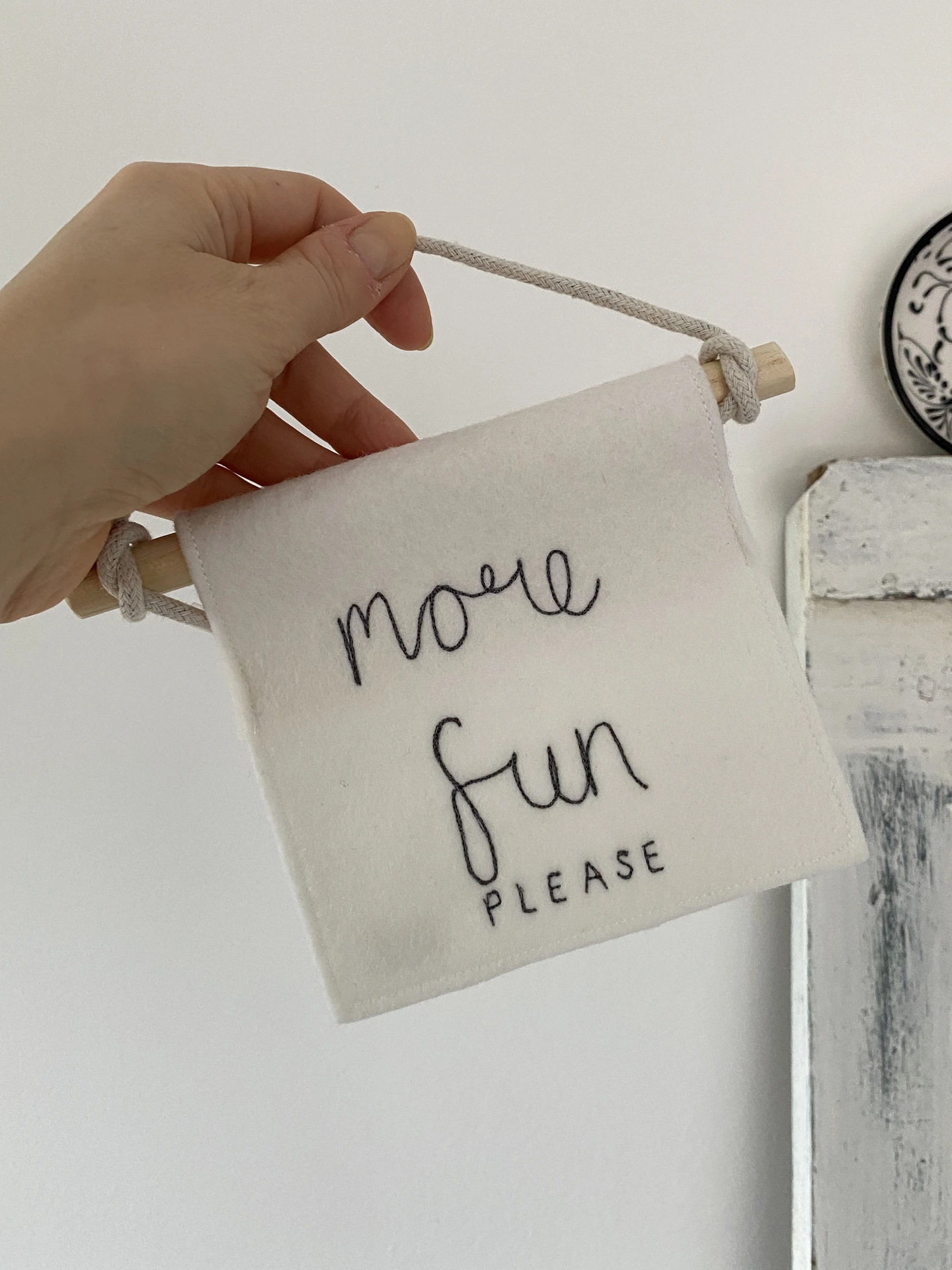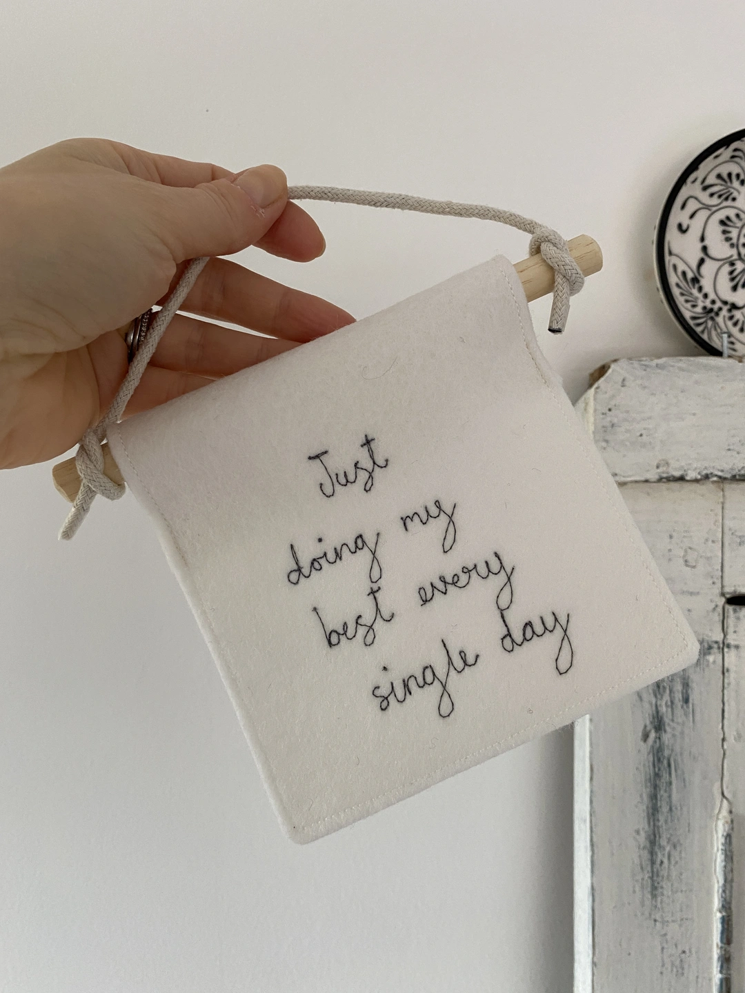 A small wool felt banner with a freehand machine embroidered sentiment of your choice.