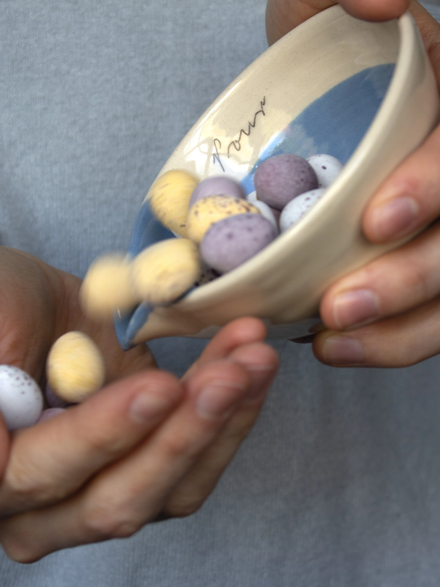 A wheel-thrown mini pouring bowl made from white stoneware with poured coloured slip and snippets of my late grandmother’s handwriting.