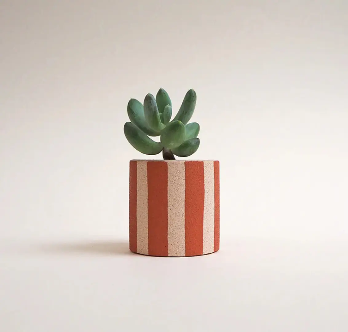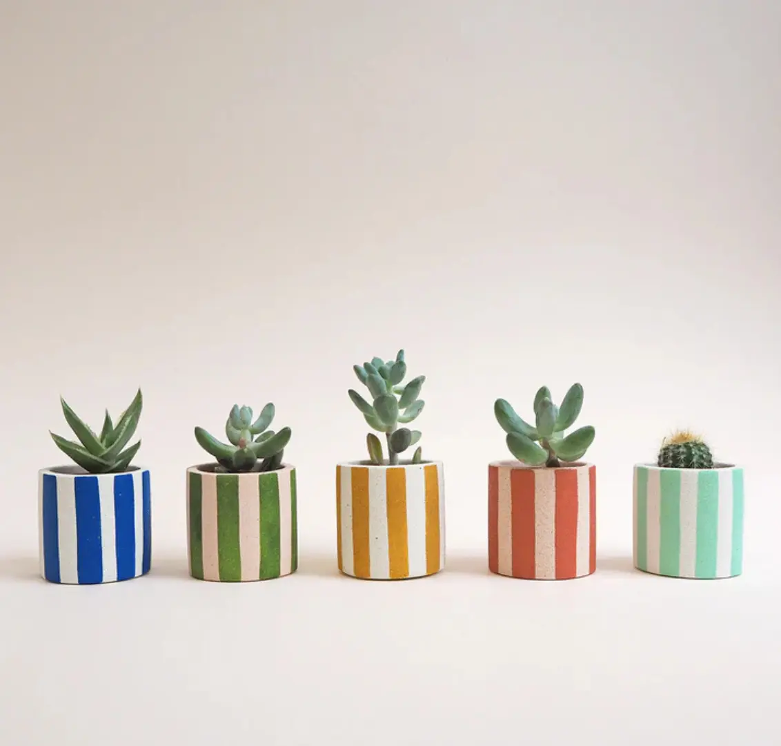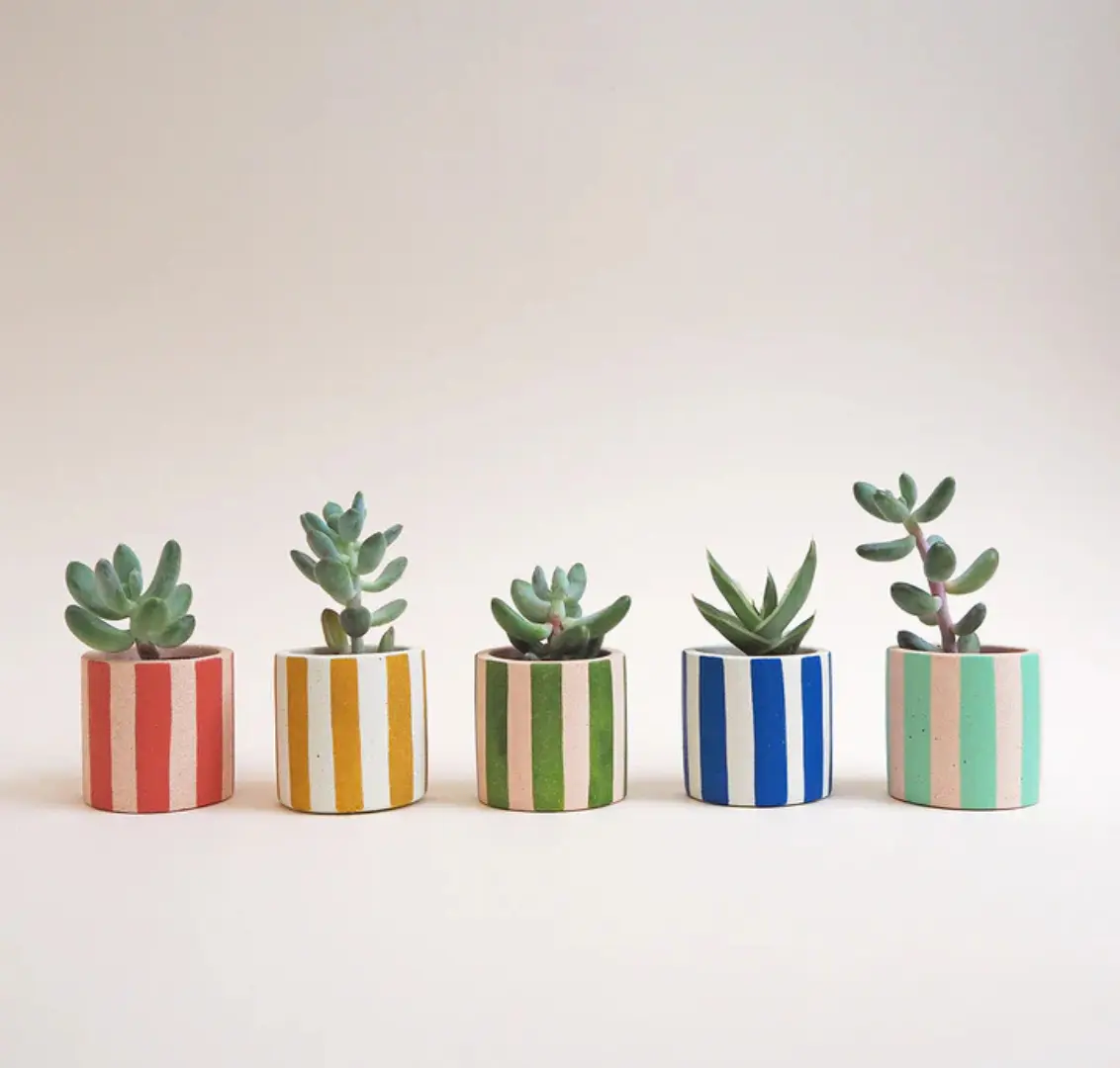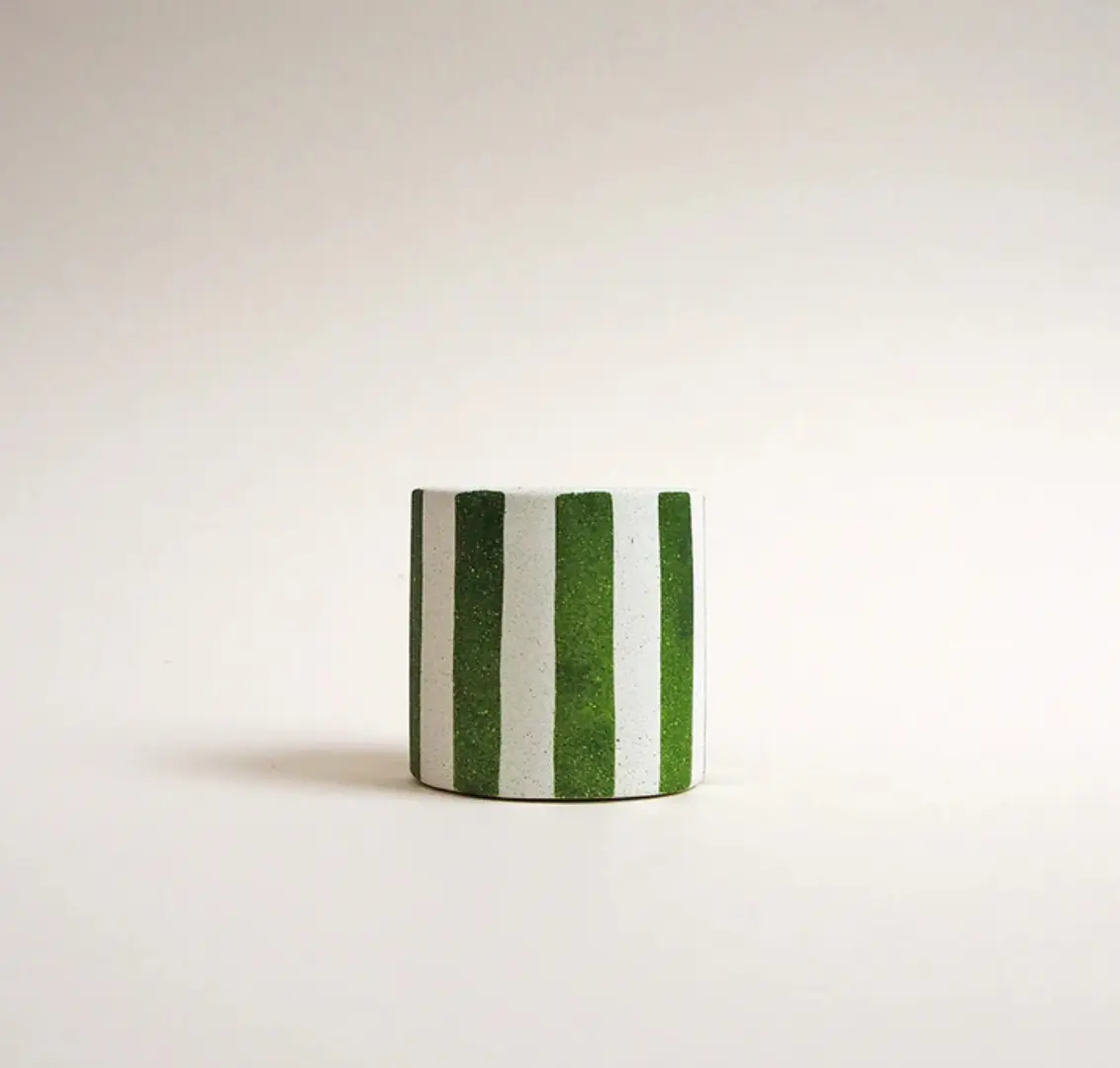 Our mini pots have been hand cast using white marble Jesmonite, creating a luxe stoneware finish with a subtle sparkle. Choose from a warm white or peachy pink base colour and then select your favourite colour of painterly stripes. Our mini pots work perf...