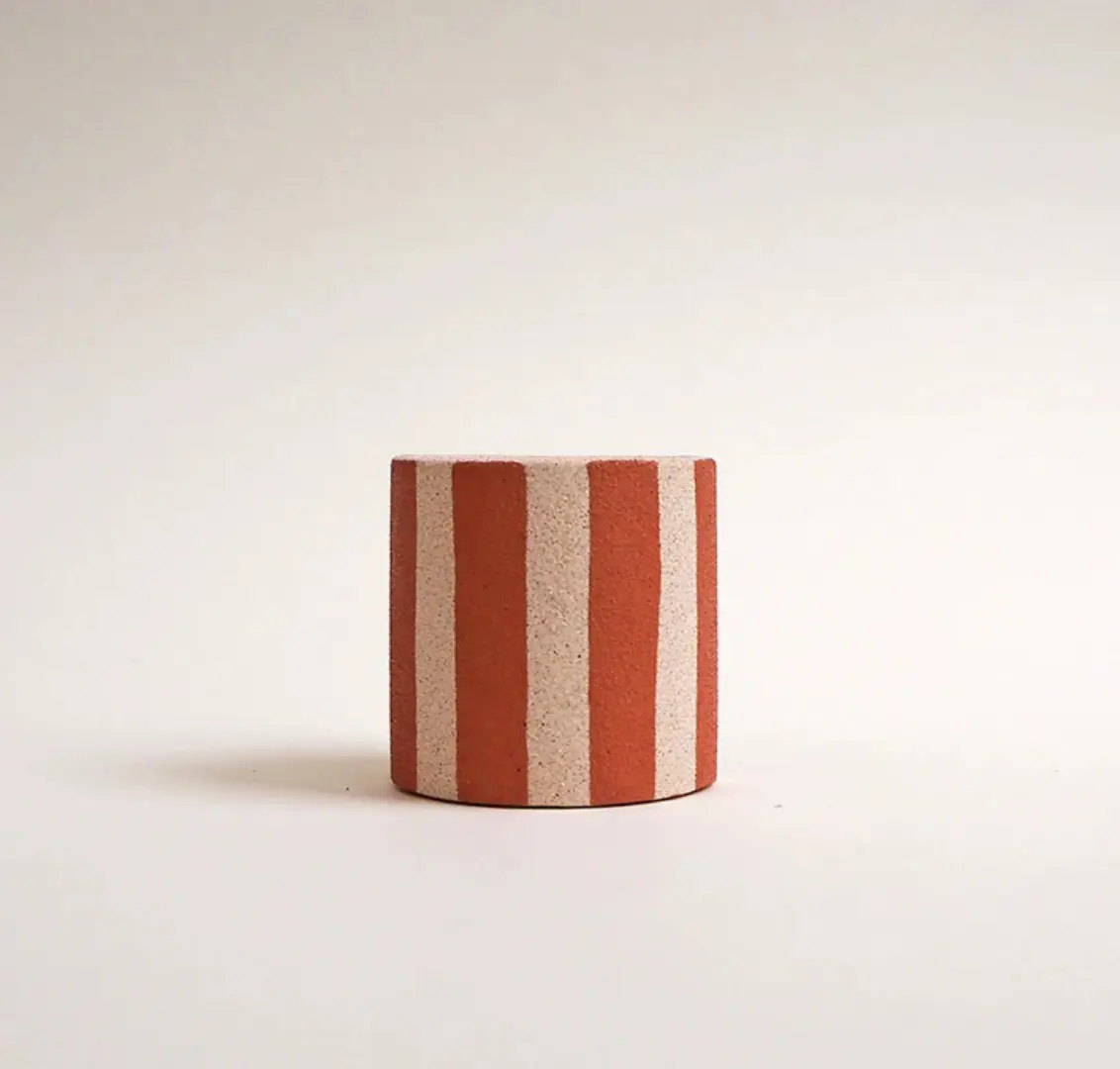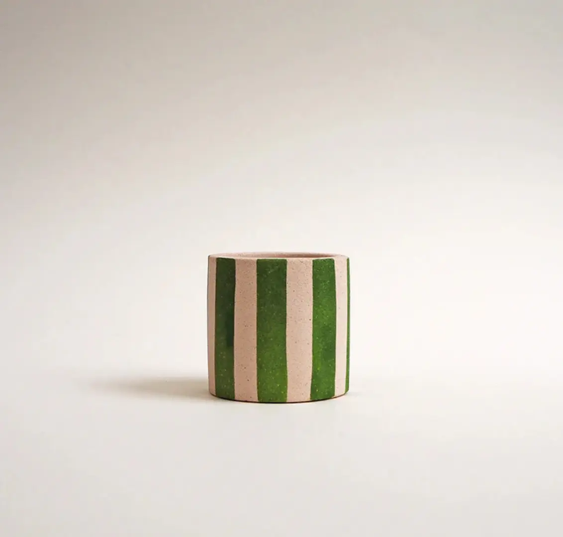 Our mini pots have been hand cast using white marble Jesmonite, creating a luxe stoneware finish with a subtle sparkle. Choose from a warm white or peachy pink base colour and then select your favourite colour of painterly stripes. Our mini pots work perfectly as mini plant pots, tea light holders or for storing small trinkets like jewellery.