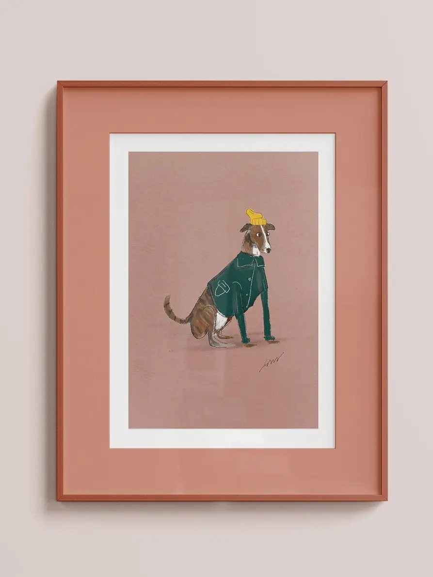 Indulge in contemporary charm with our Greyhound illustration art print. This sleek portrayal of the beloved breed exudes sophistication, with a hint of humour woven into its minimalist design.
