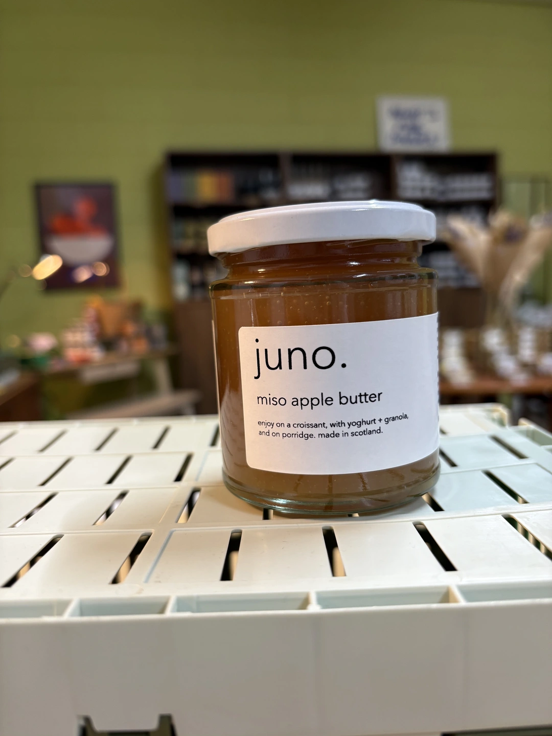 a thick + smooth apple jam with miso, ideal for spooning over porridge, yoghurt, rice pudding and ice cream.
