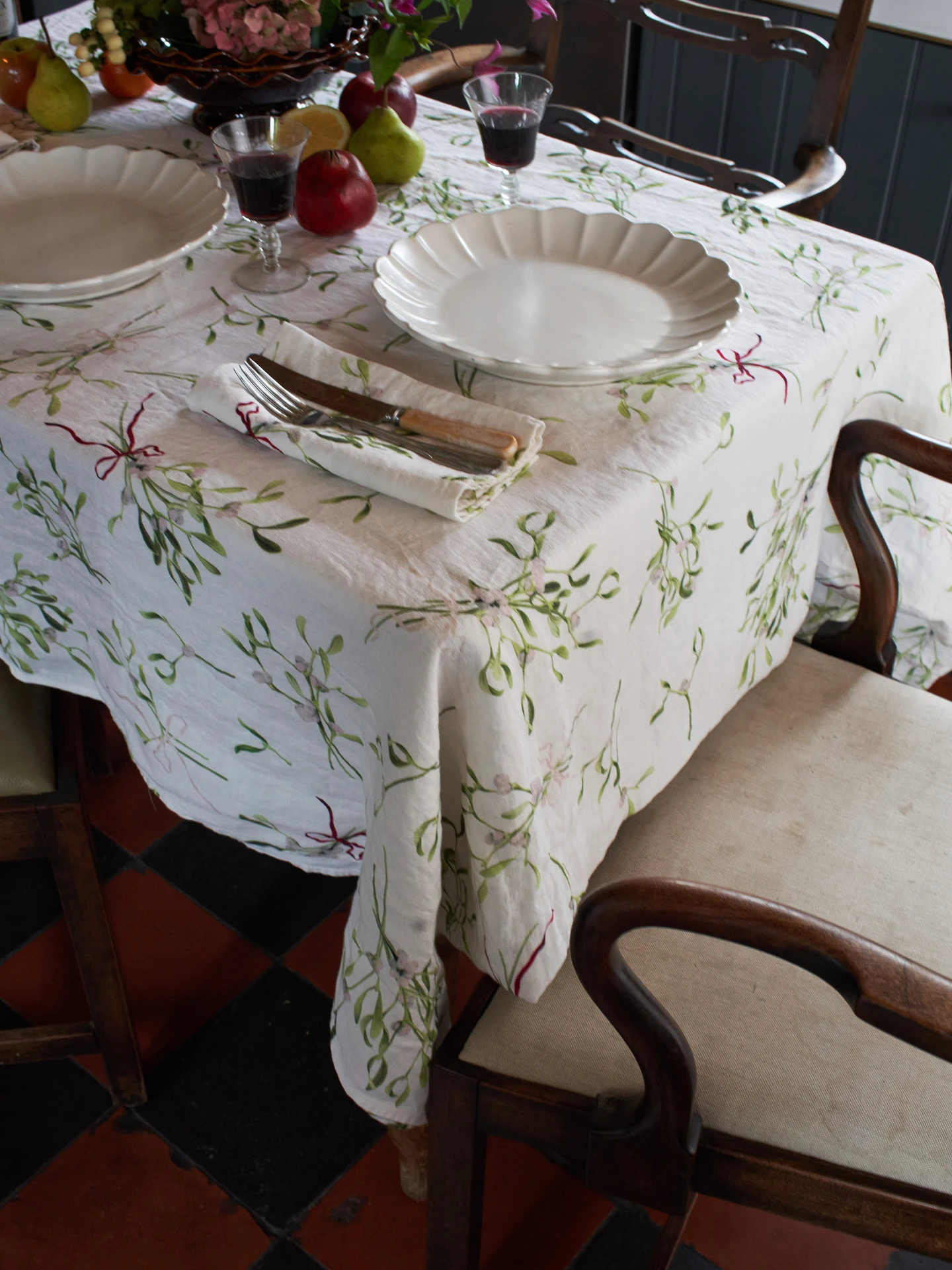 Introducing our Mistletoe linens. The perfect print for holiday gatherings and festive table settings. Adorned with leafy, white-berried bunches all tied up in bows. These linens capture the magic of moments shared and the love exchanged around the table. The fresh greens on crisp white linen keep this design timeless and perfect for you to use year after year.