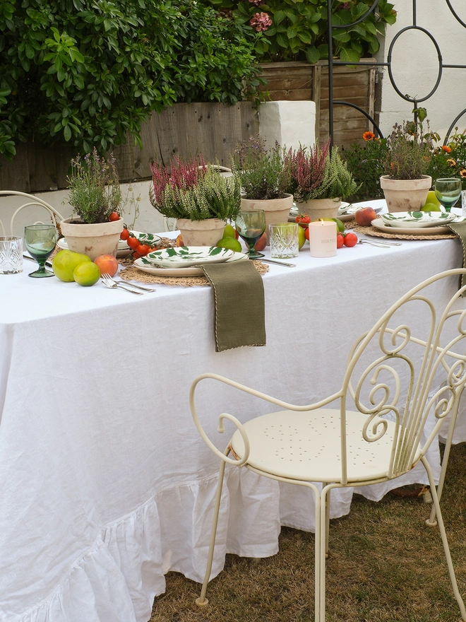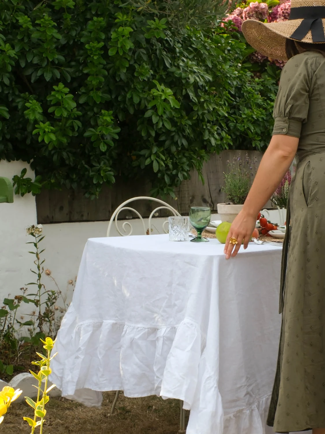 Elevate every occasion with the quiet beauty of our Mistral Drape tablecloths, thoughtfully designed to suit both everyday meals and special moments. Brume is our grounding neutral, warm, creamy and quietly elegant, while Voile offers a breath of fresh air, crisp and luminous like early daylight. Crafted from the finest linen, both styles feature a fluid drape and a generous ruffle, bringing softness and poetry to the everyday. Whether styled for laid-back lunches or elevated evening gatherings, these tablecloths are designed for timeless tablescapes that invite conversation and connection.