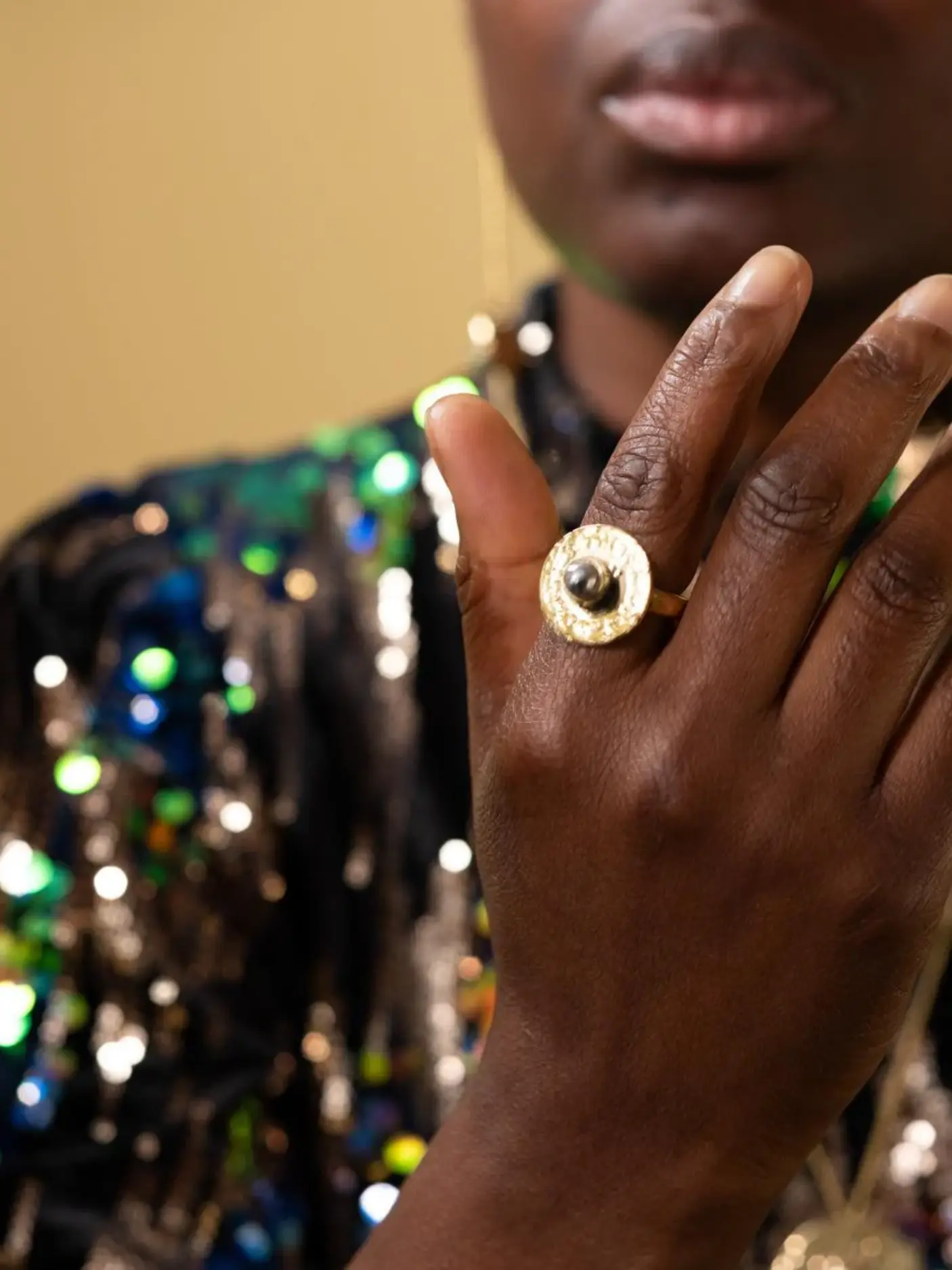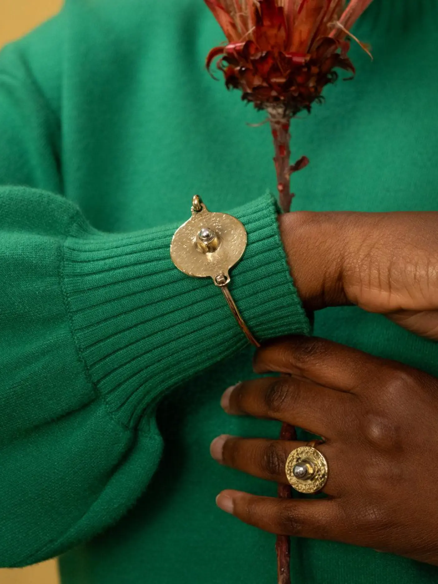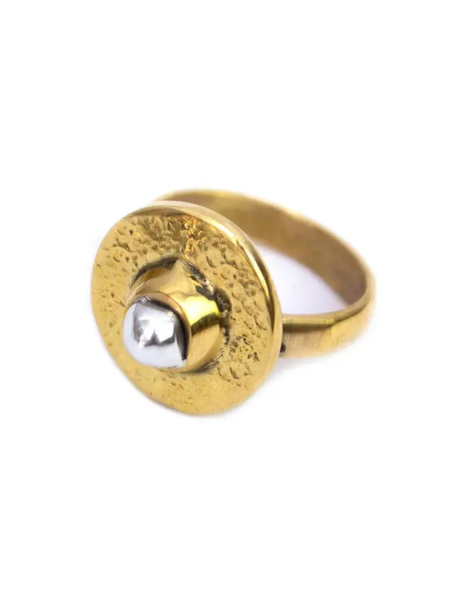 Ethically handmade in Kenya by our team of talented artisans. The brass is hand-hammered to give it a beautiful shimmer, making it an eye-catching accessory. The organic hammered texture and smooth aluminium ‘pearl’ makes this ring a wearable work of art.