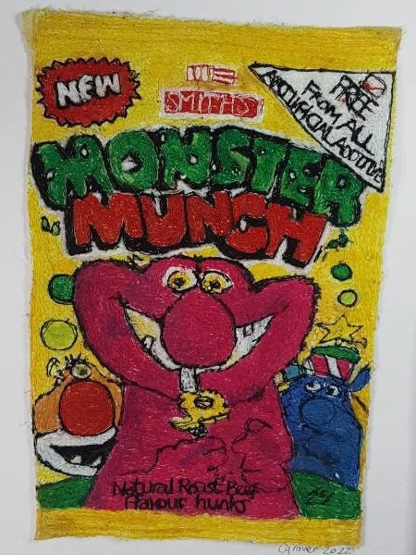 This is a unique, one-of-a-kind embroidery piece inspired by the beloved Roast Beef Monster Munch!