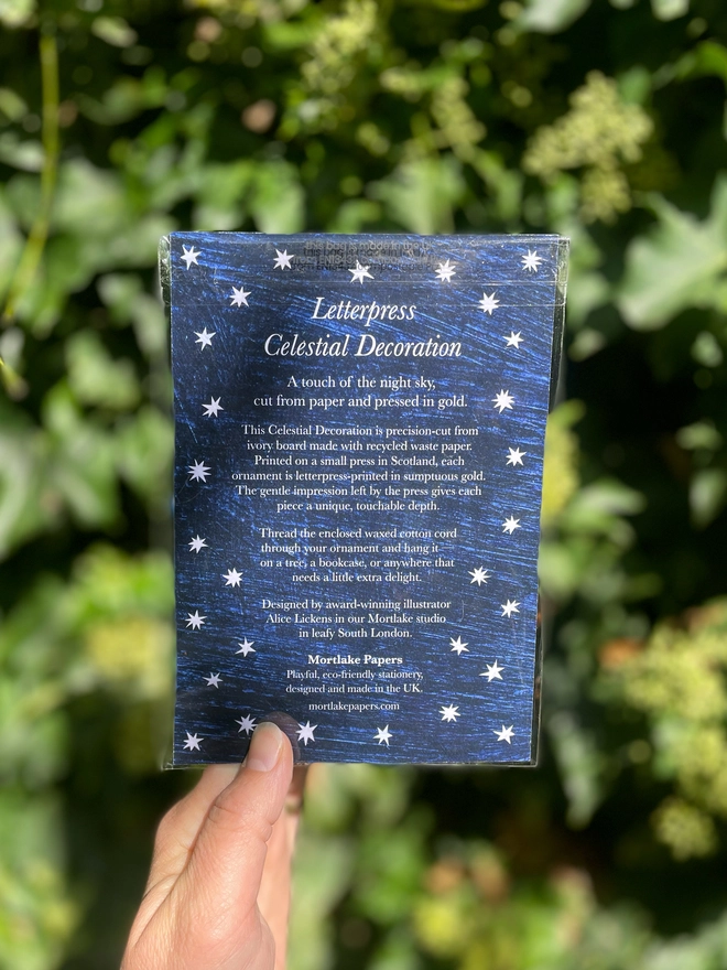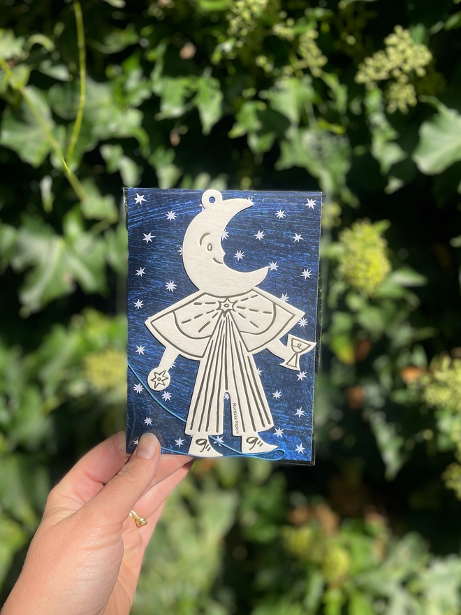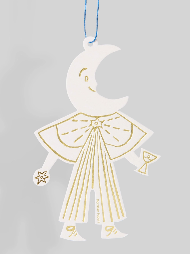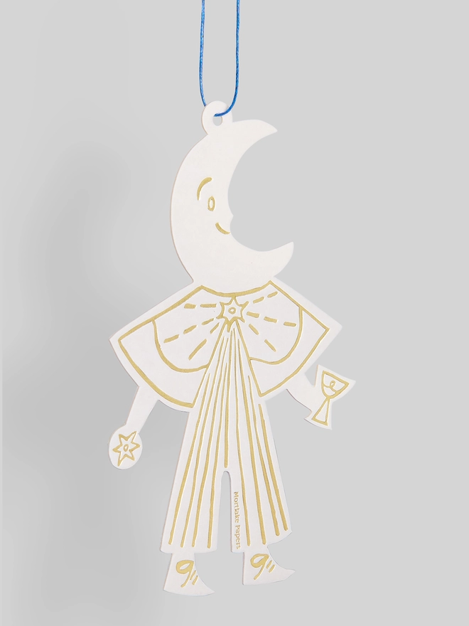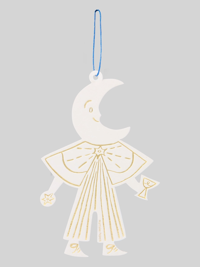 Bring some celestial charm into your home with this letterpress folk decoration, a whimsical holiday ornament in the shape of a moon-faced figure, brought to life in paper form. The design of the enchanting keepsake features stamped gold foil details that glitter beautifully, and comes with a blue cotton cord ready to hang. The mystical creation's folk inspirations make it a great holiday ornament for celebrating winter solstice, Halloween, or a Christmas tree decoration, and is perfect for slipping inside a Christmas card as an easy-to-post gift.