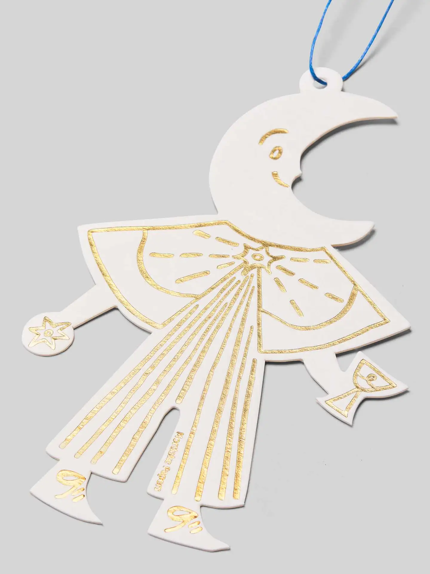 Bring some celestial charm into your home with this letterpress folk decoration, a whimsical holiday ornament in the shape of a moon-faced figure, brought to life in paper form. The design of the enchanting keepsake features stamped gold foil details that...
