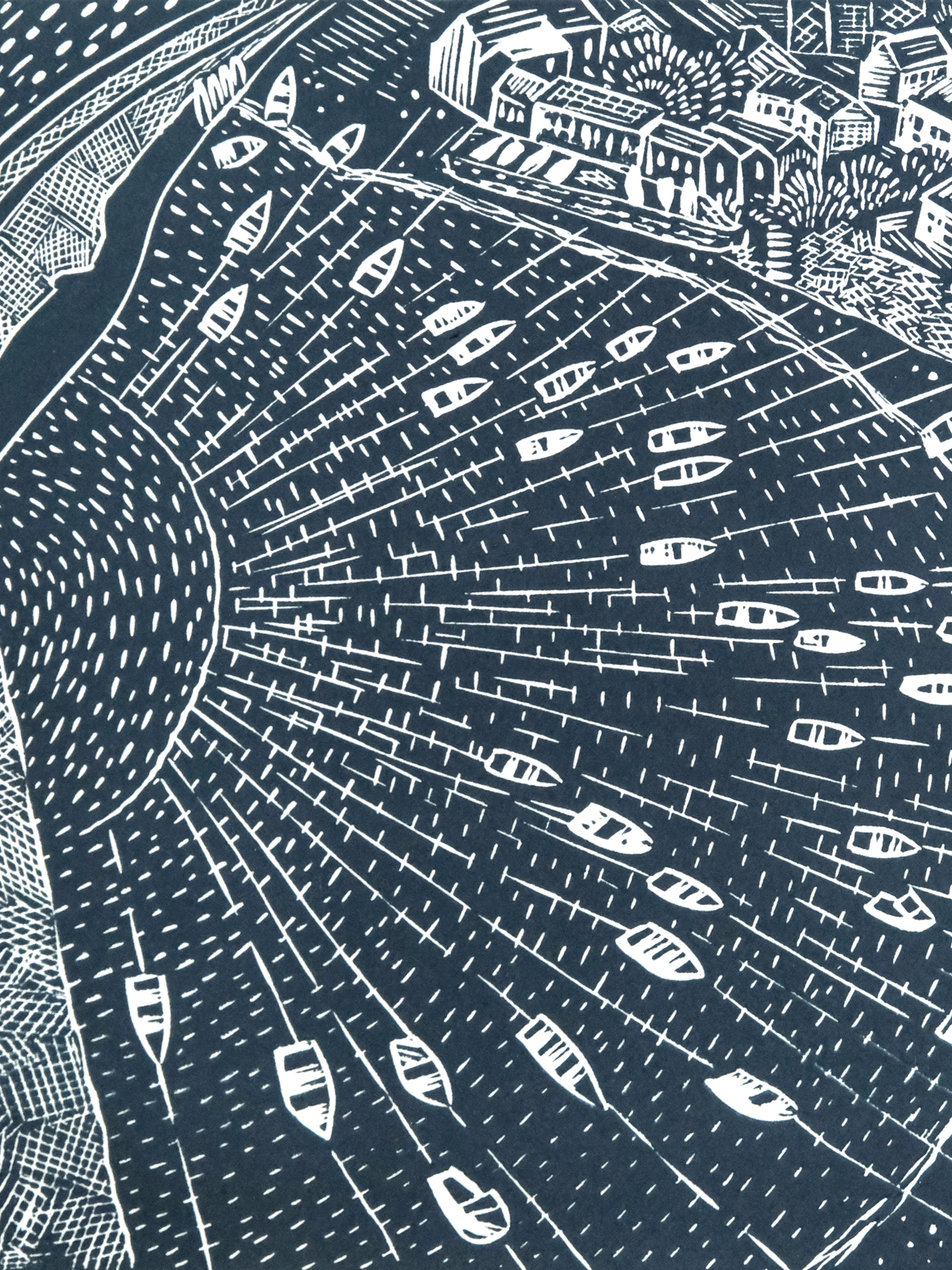 Printed onto the finest Somerset paper printed in Lino Lord's own 'Lugger Blue' ink, in association with Ironbridge Printmakers.