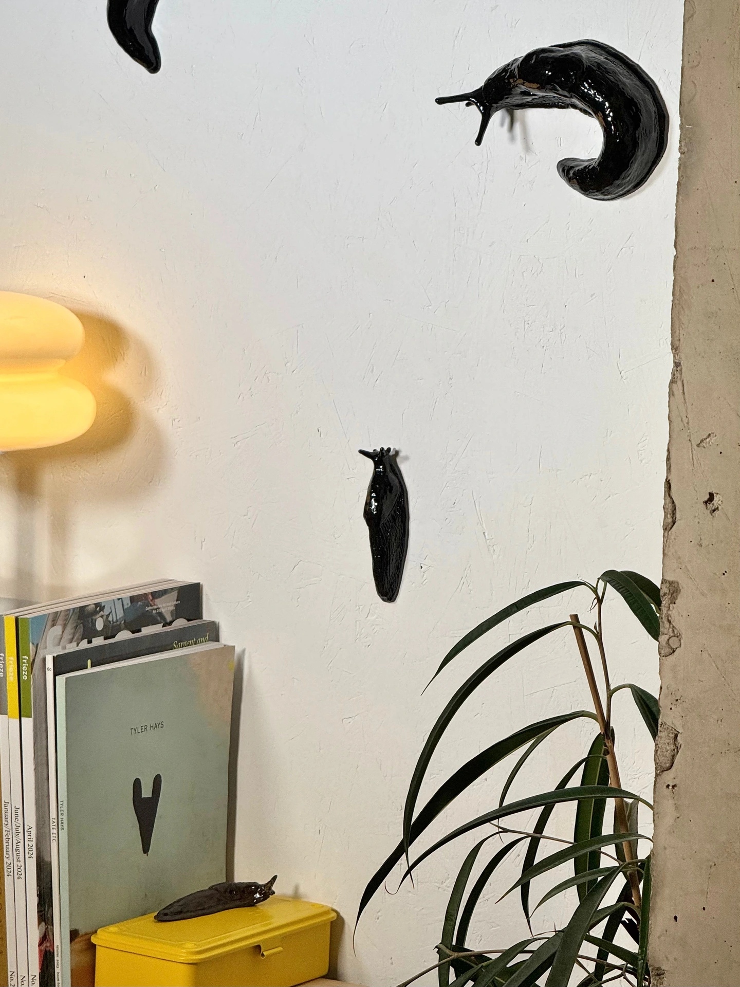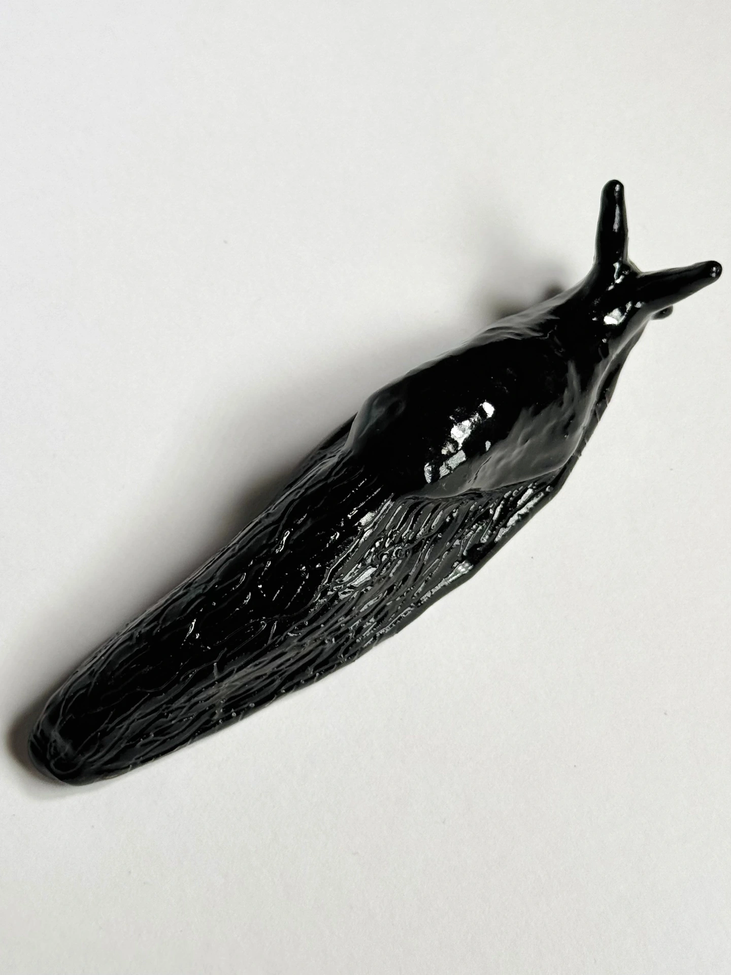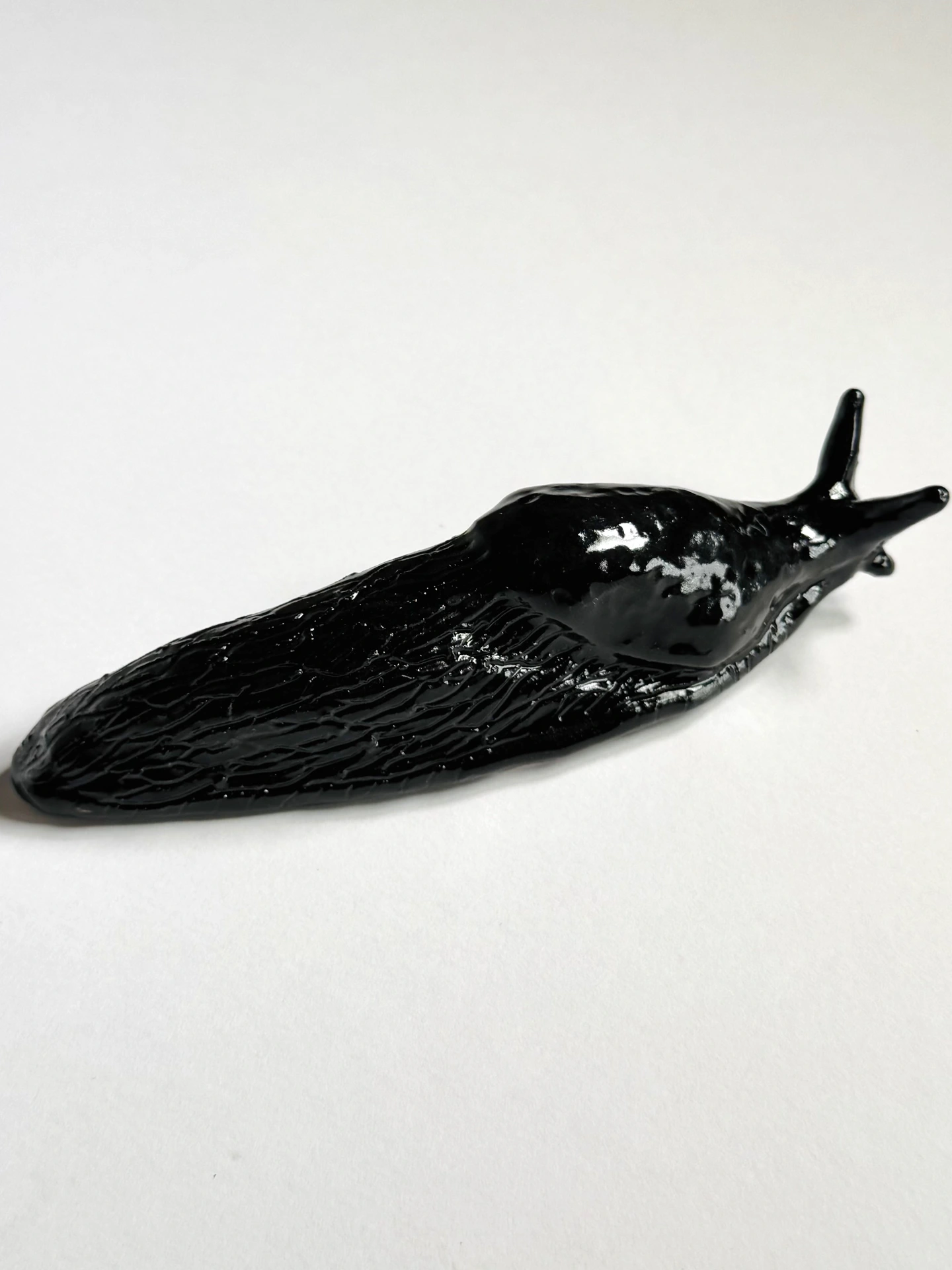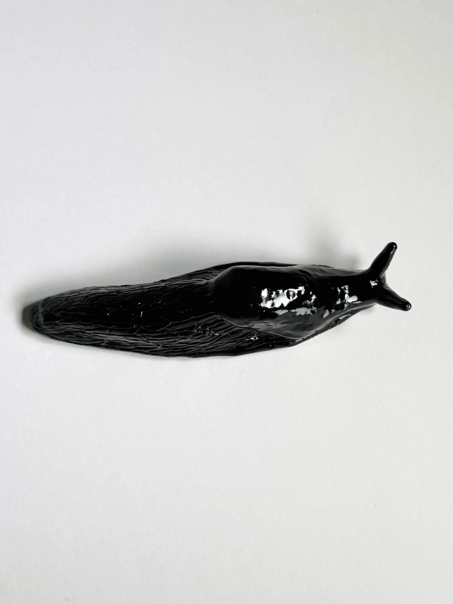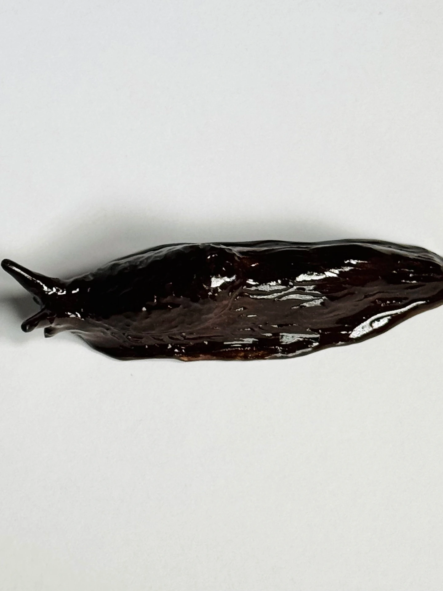Small stoneware ceramic slug sculpture by Tally Walker Warne. Each small slug is gift packaged in a black, snap shut, magnetic gift box with a ribbon tab.