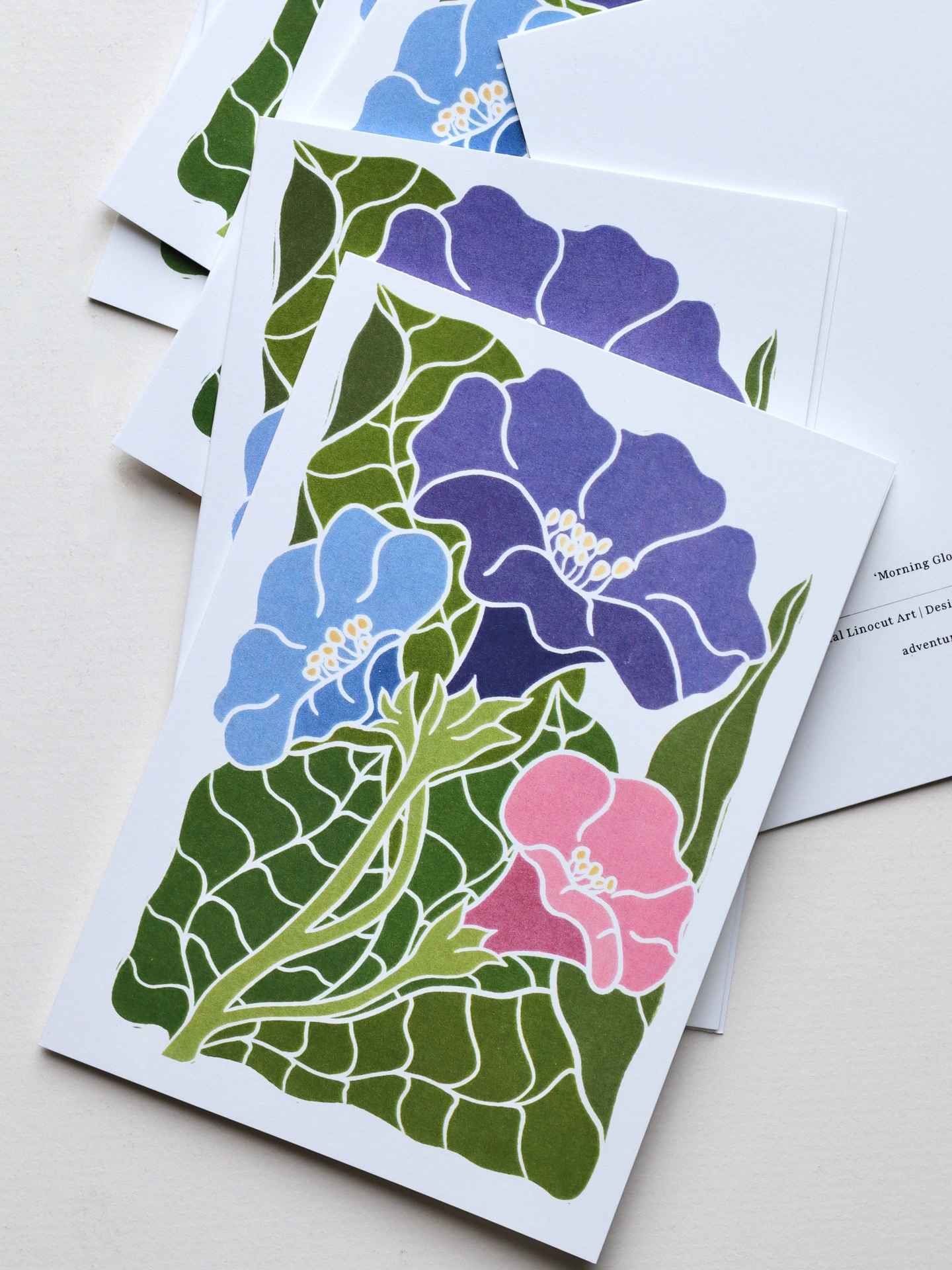 Morning glories symbolise affection, new beginnings, and the beauty of living in the moment - each bloom lasting just one day before making way for the next. These bold botanical notecards capture that spirited energy with hand-carved linocut design and vibrant jewel-toned colours.