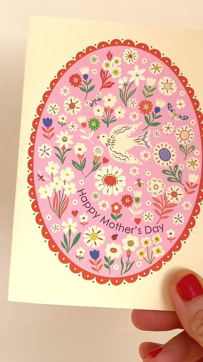 A beautifully illustrated Mother’s Day card featuring a delicate bird surrounded by pretty flowers and butterflies, framed within a decorative red border...