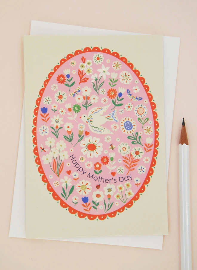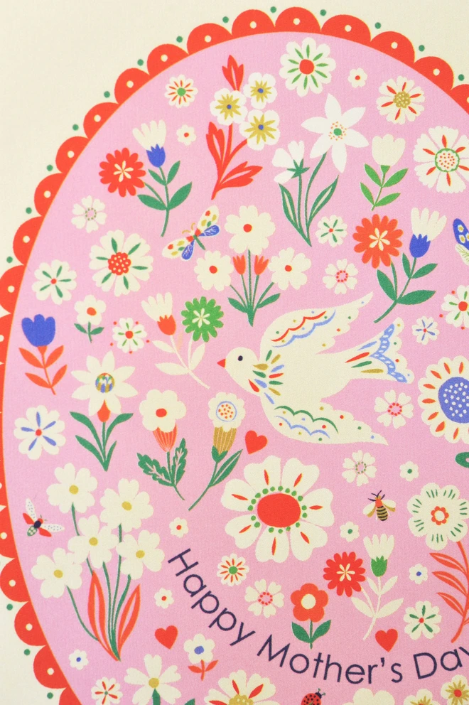 A beautifully illustrated Mother’s Day card featuring a delicate bird surrounded by pretty flowers and butterflies, framed within a decorative red border.
