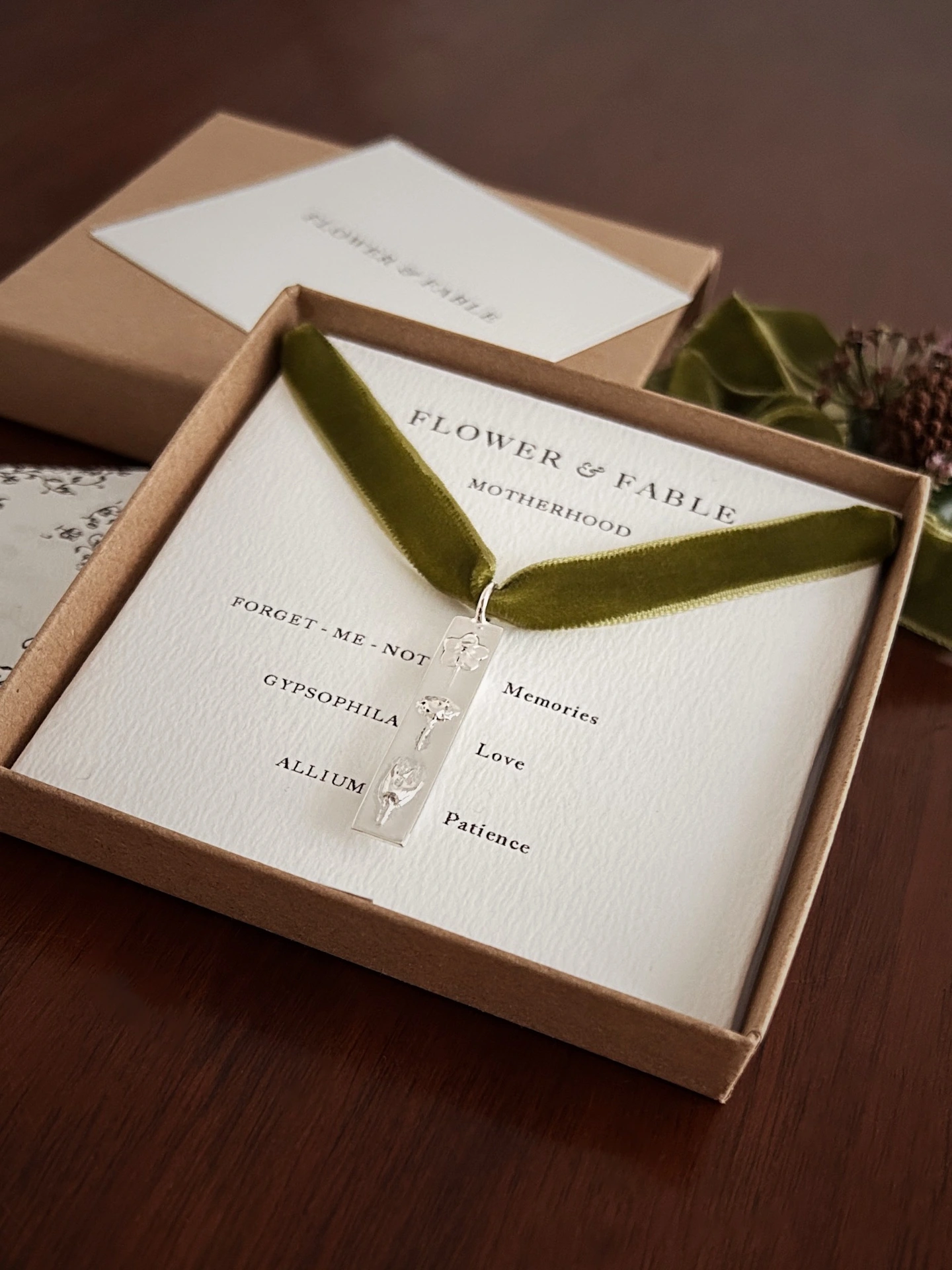 Our floriography bar pendants are made with real flowers in sterling silver, using the traditional technique of lost wax casting. Each one is beautifully packaged with our signature box posy, which changes with the seasons.