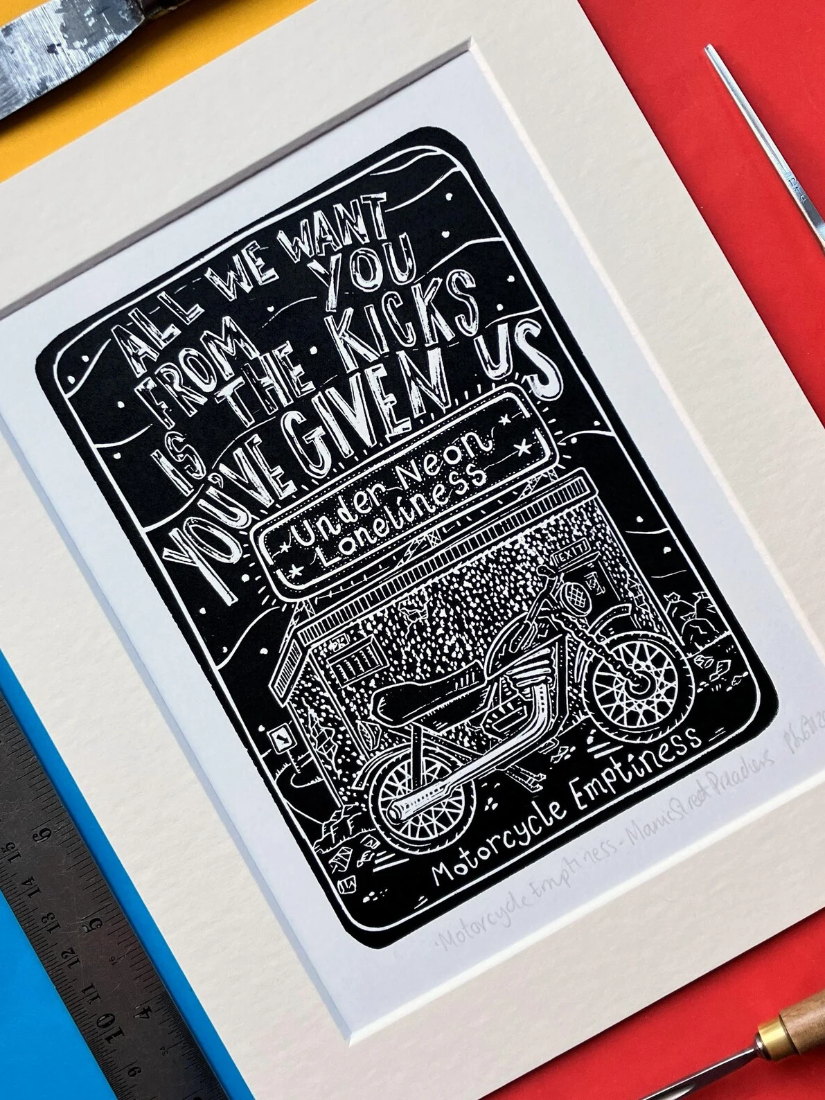 Original linocut print inspired by lyrics from the song 'Motorcycle Emptiness' by Manic Street Preachers, from their debut album 'Generation Terrorists' from 1992.