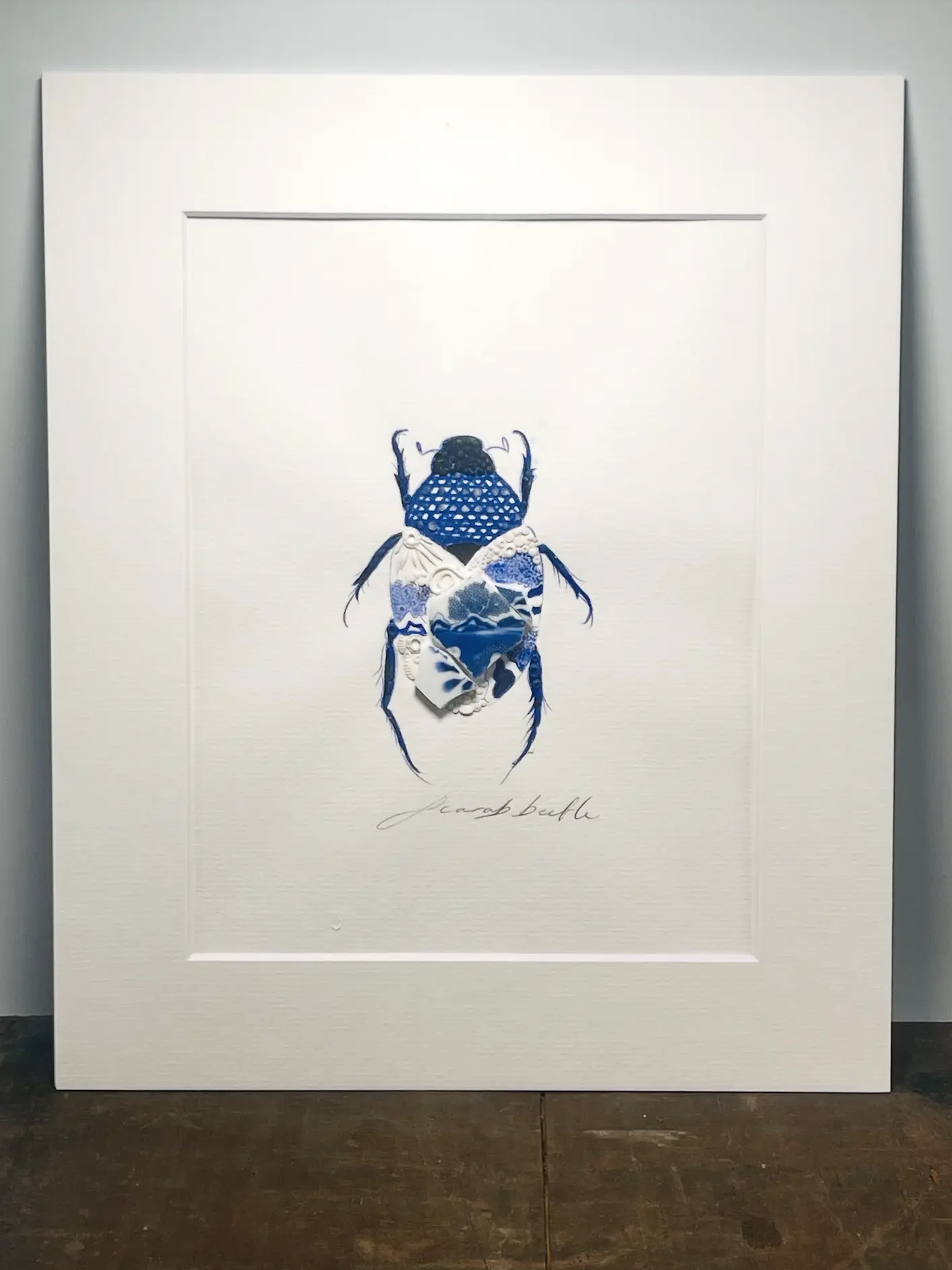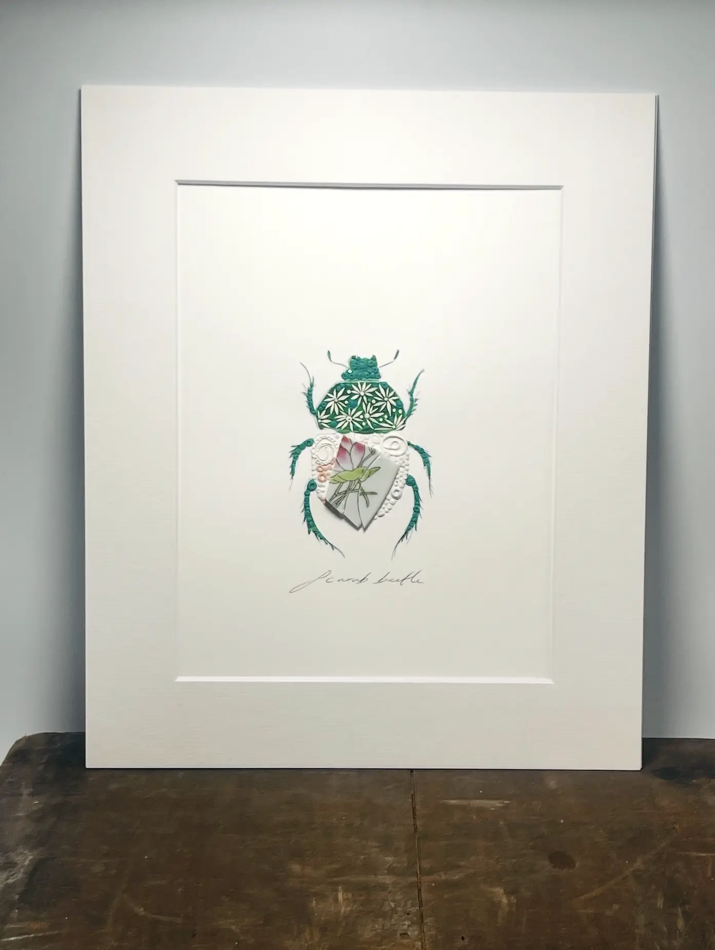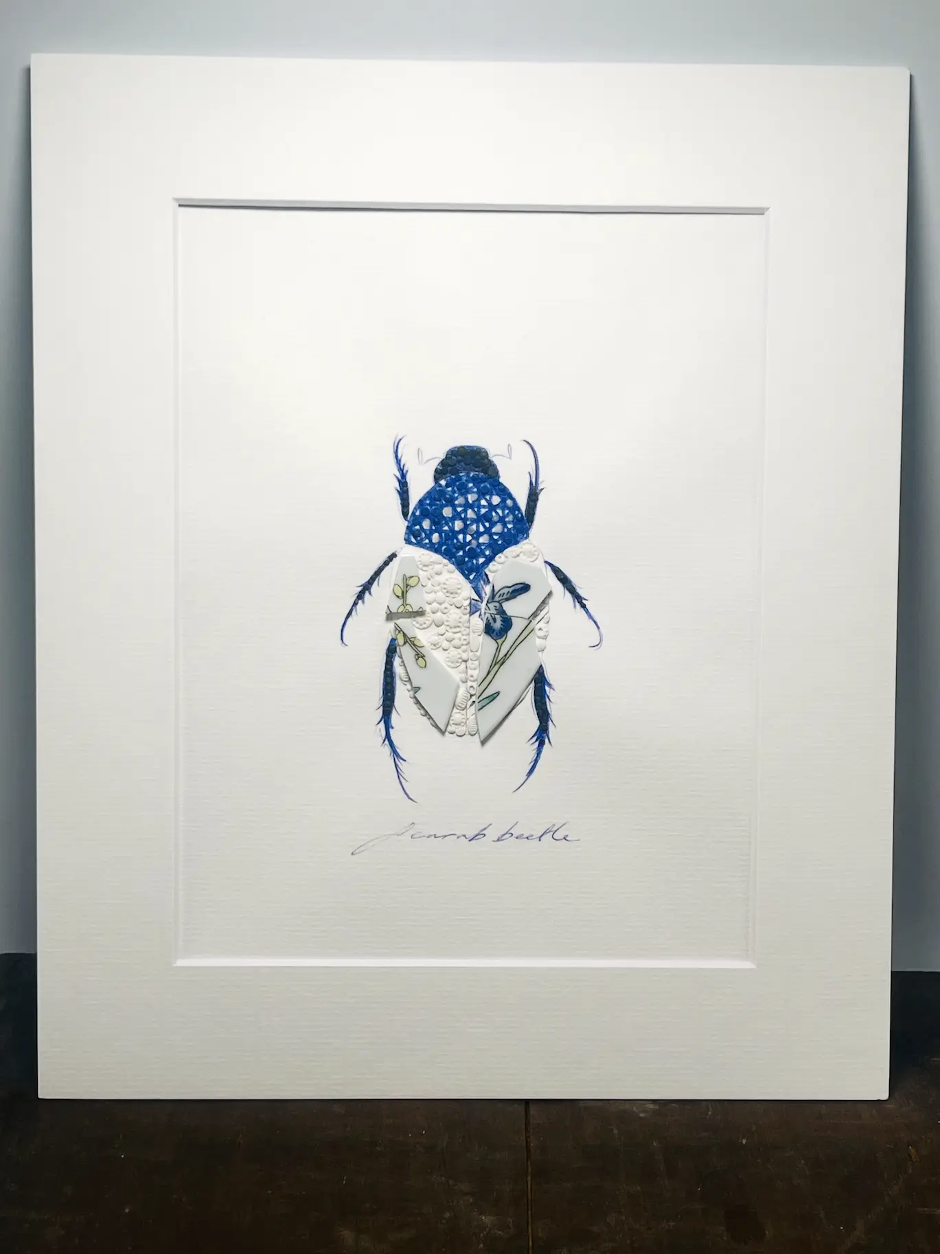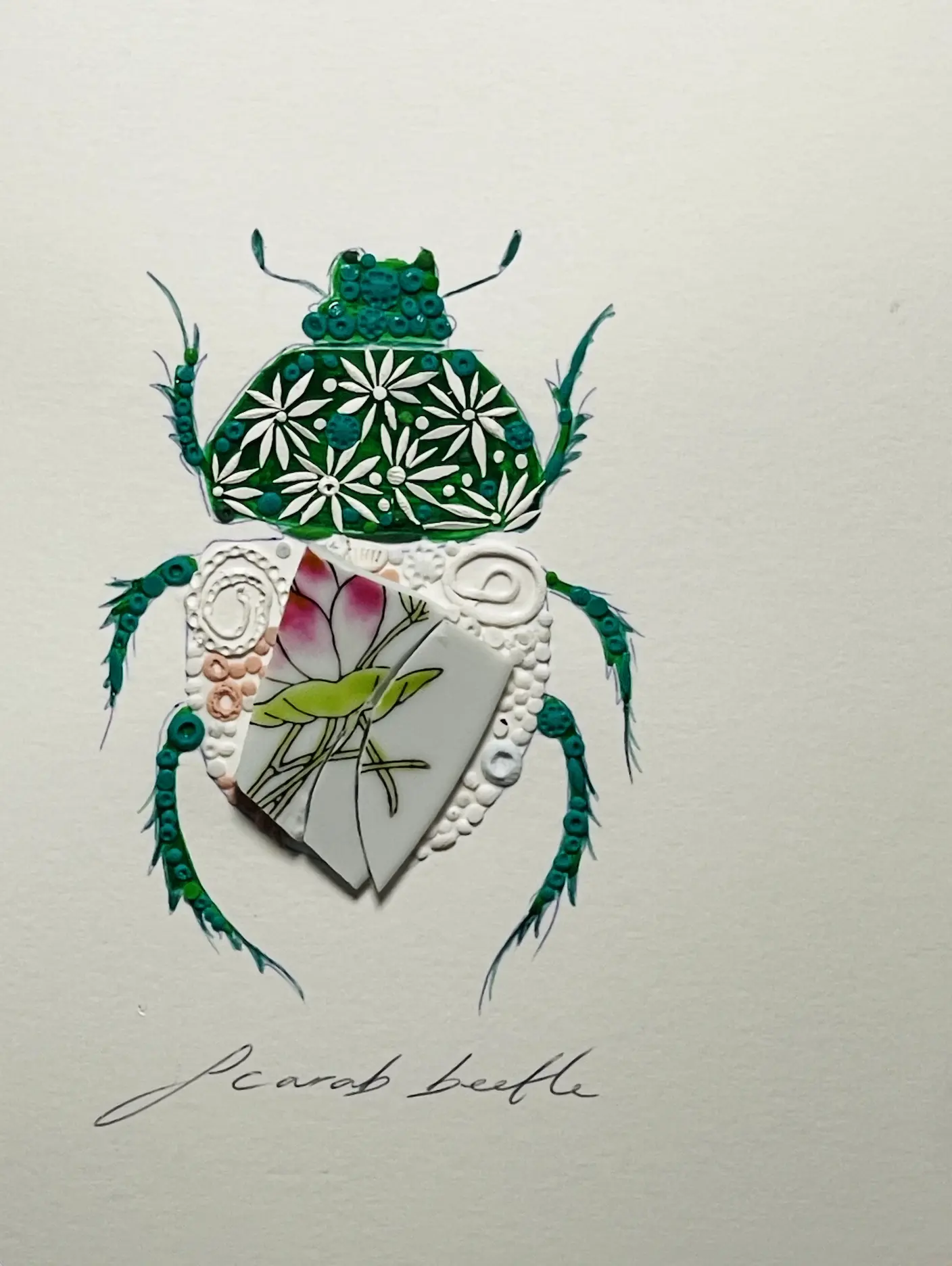 Hand-drawn, painted, mosaic clay, vintage pottery insect on white double mounted card, matching white...