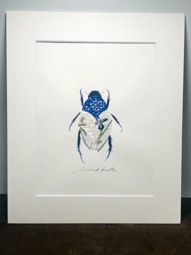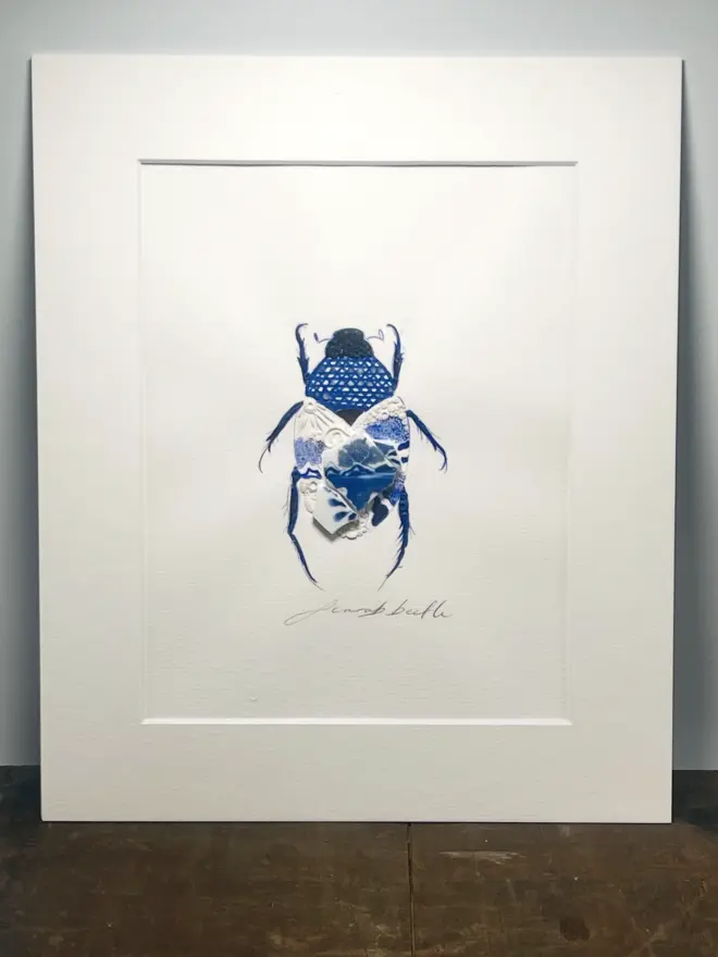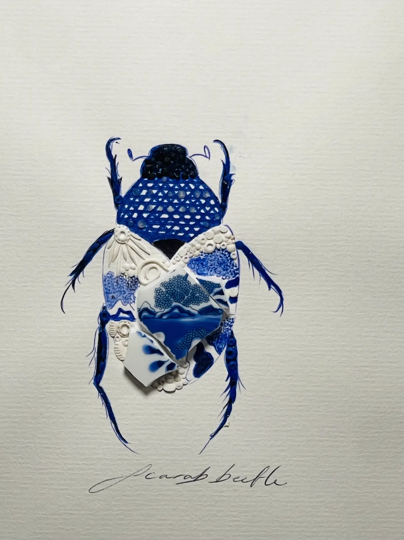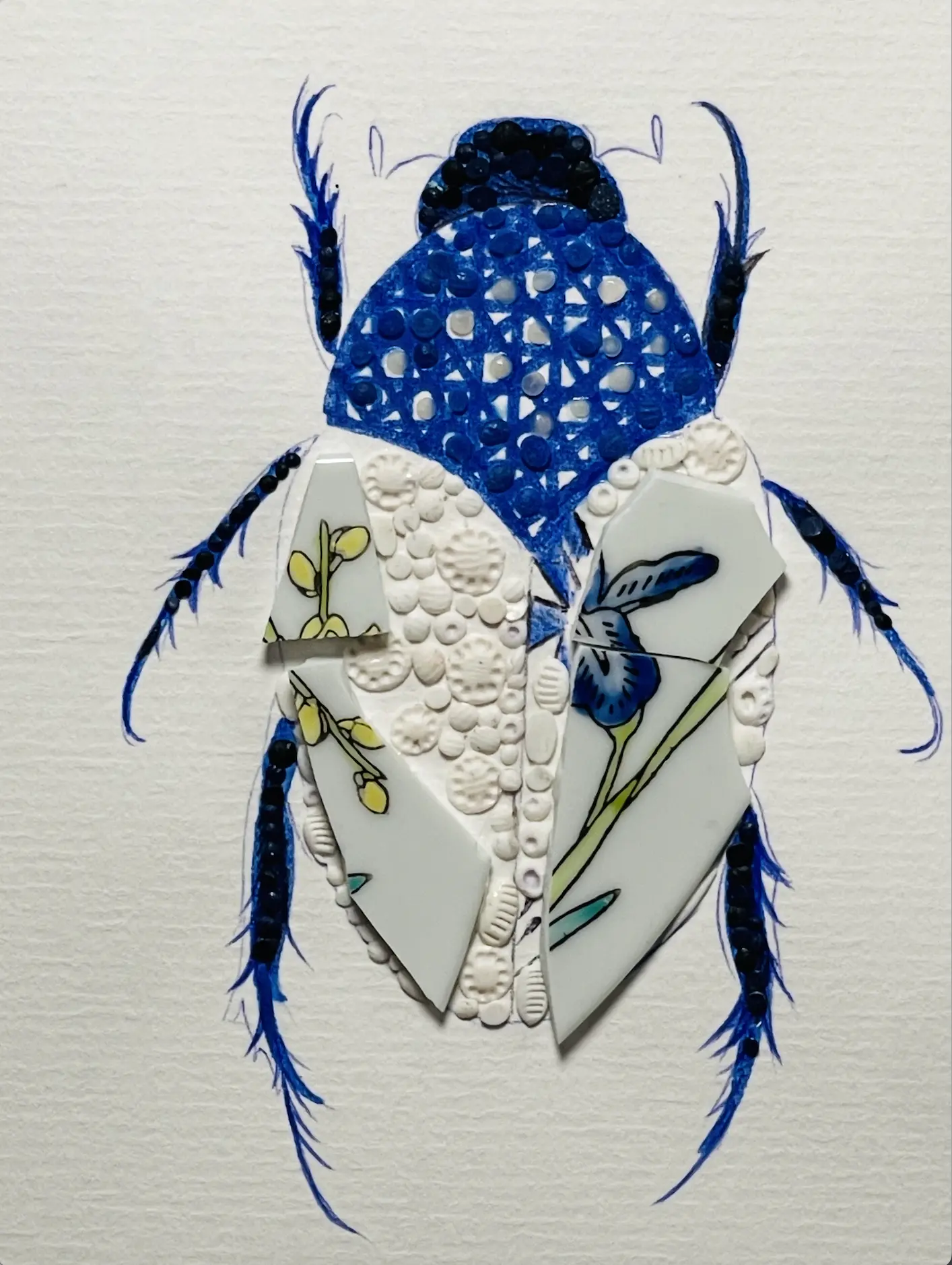 Hand-drawn, painted, mosaic clay, vintage pottery insect on white double mounted card, matching white