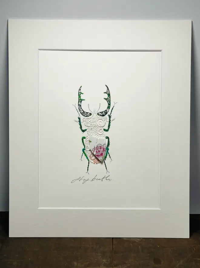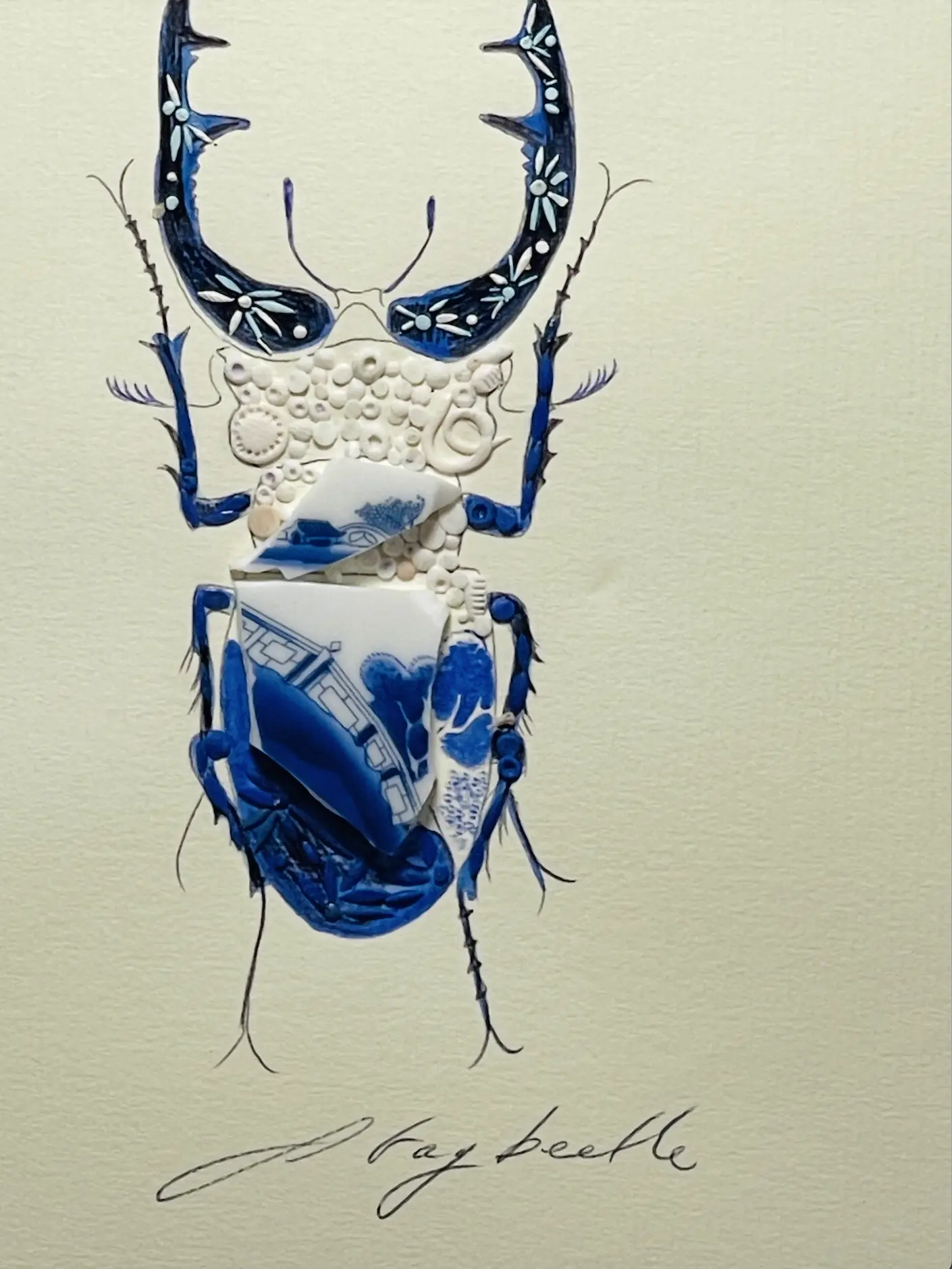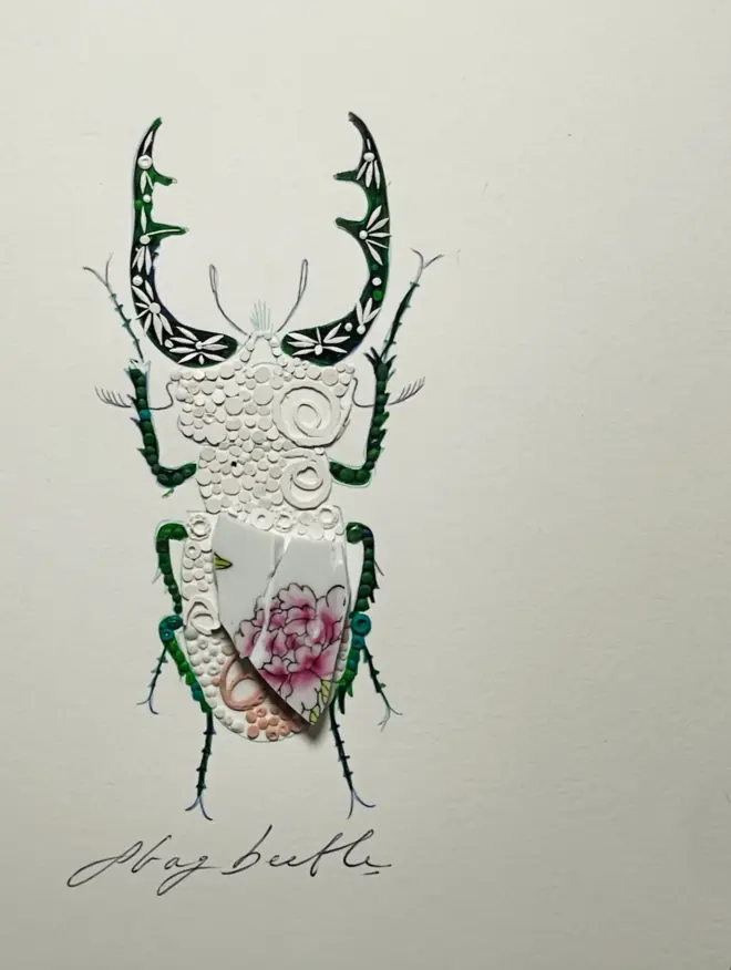 Hand-drawn, painted, mosaic clay, vintage pottery insect on white double mounted card, matching white