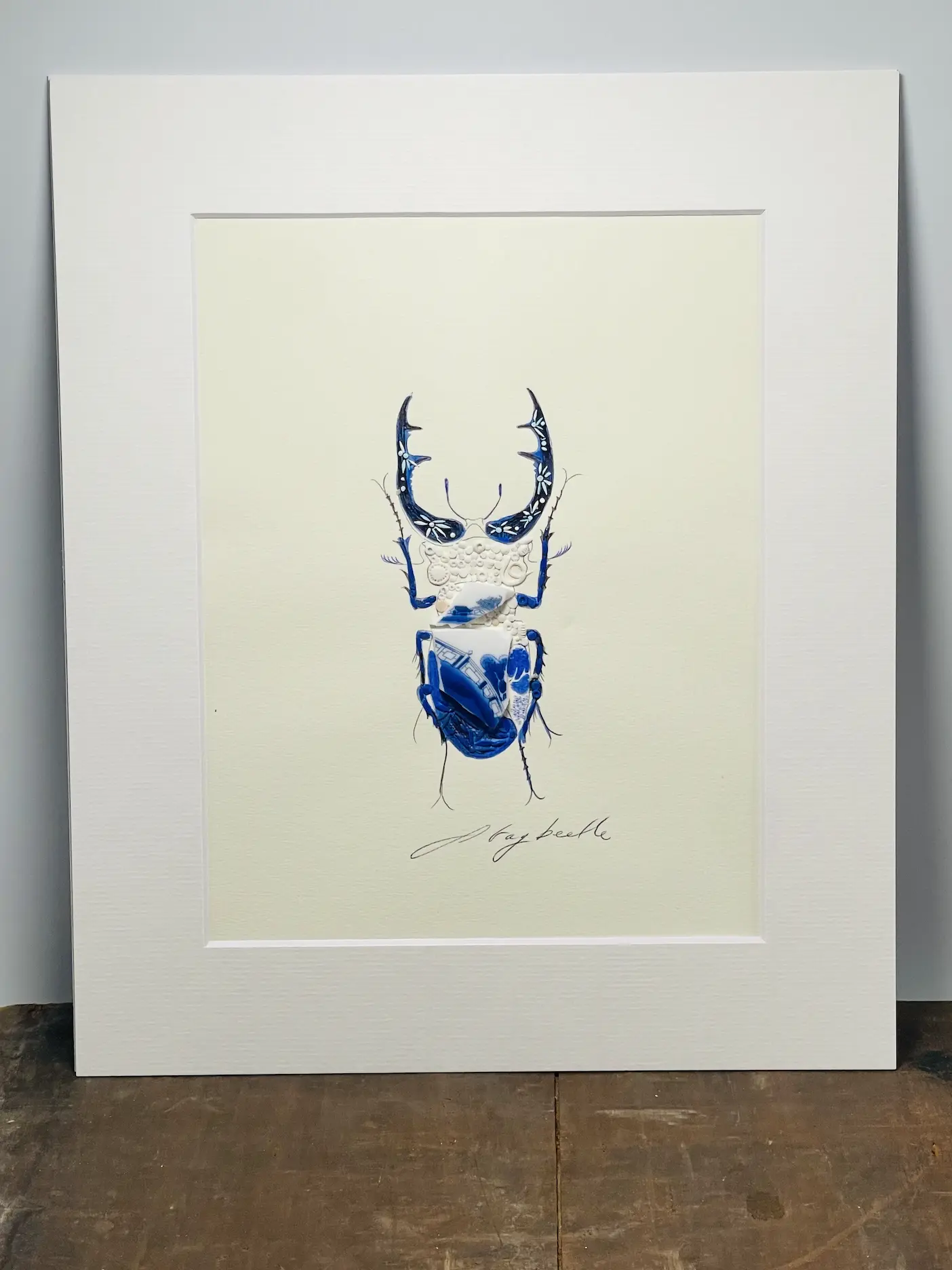 Hand-drawn, painted, mosaic clay, vintage pottery insect on white double mounted card, matching white...