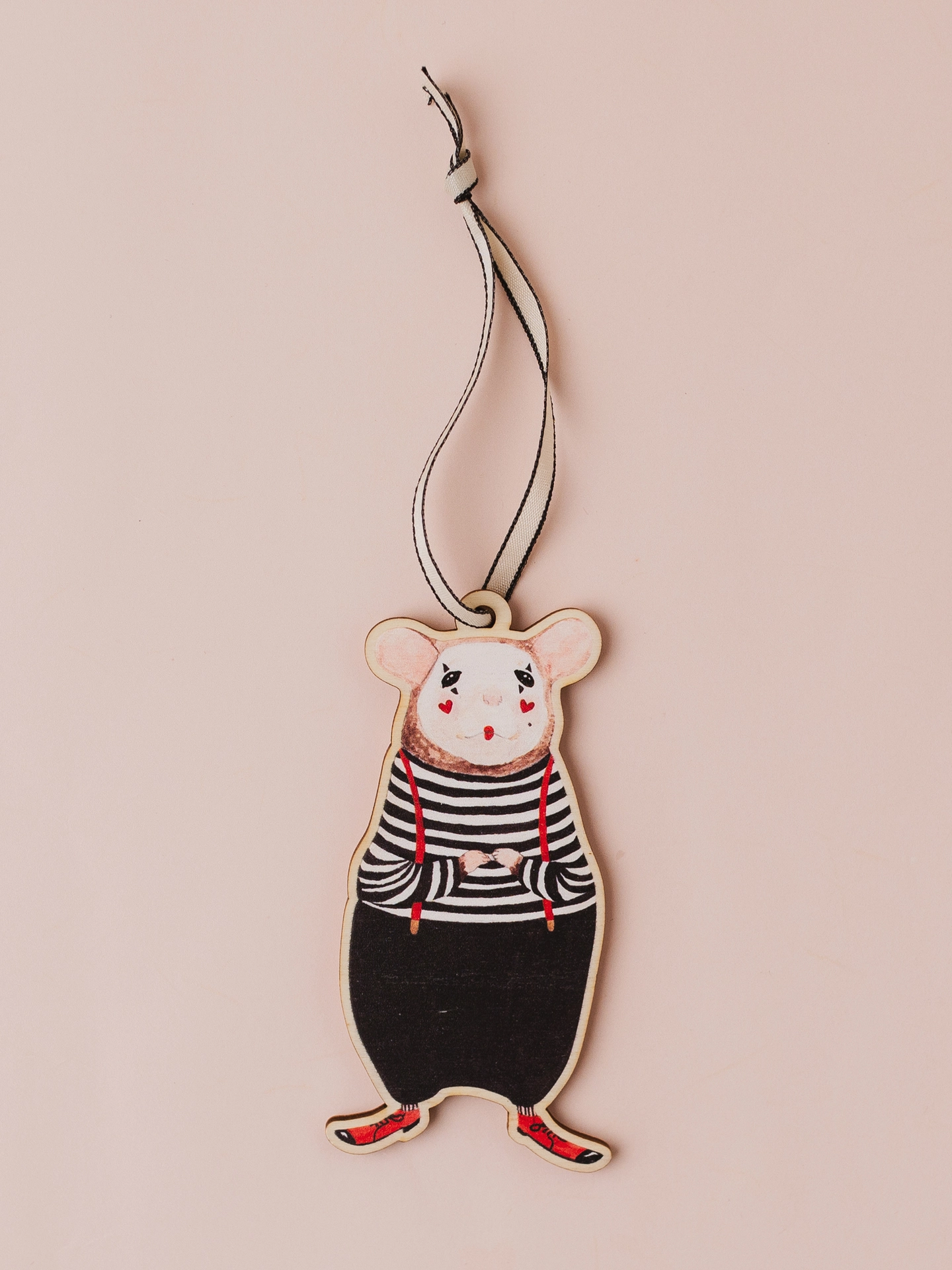 A wooden decoration, of a mouse mime in his stripy outfit perfect to hang around the house or on your Christmas tree.