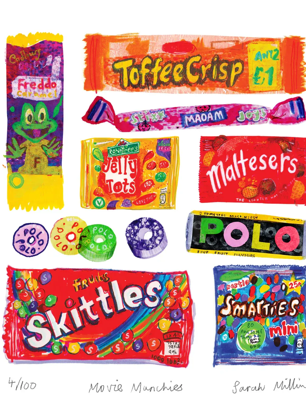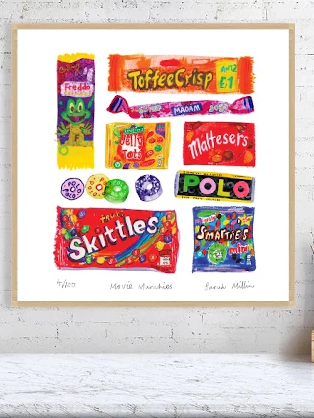 Lots of your favourite sweets to munch on at the cinema, Movie Munchies. Just don't chew too loud while watching the film! Featuring Toffee Crisp, Fruit Polos, Skittles, Freddo, Maoam, Jelly Tots, Maltesers and Smarties. A custom product produced from hand created mixed-media artwork.